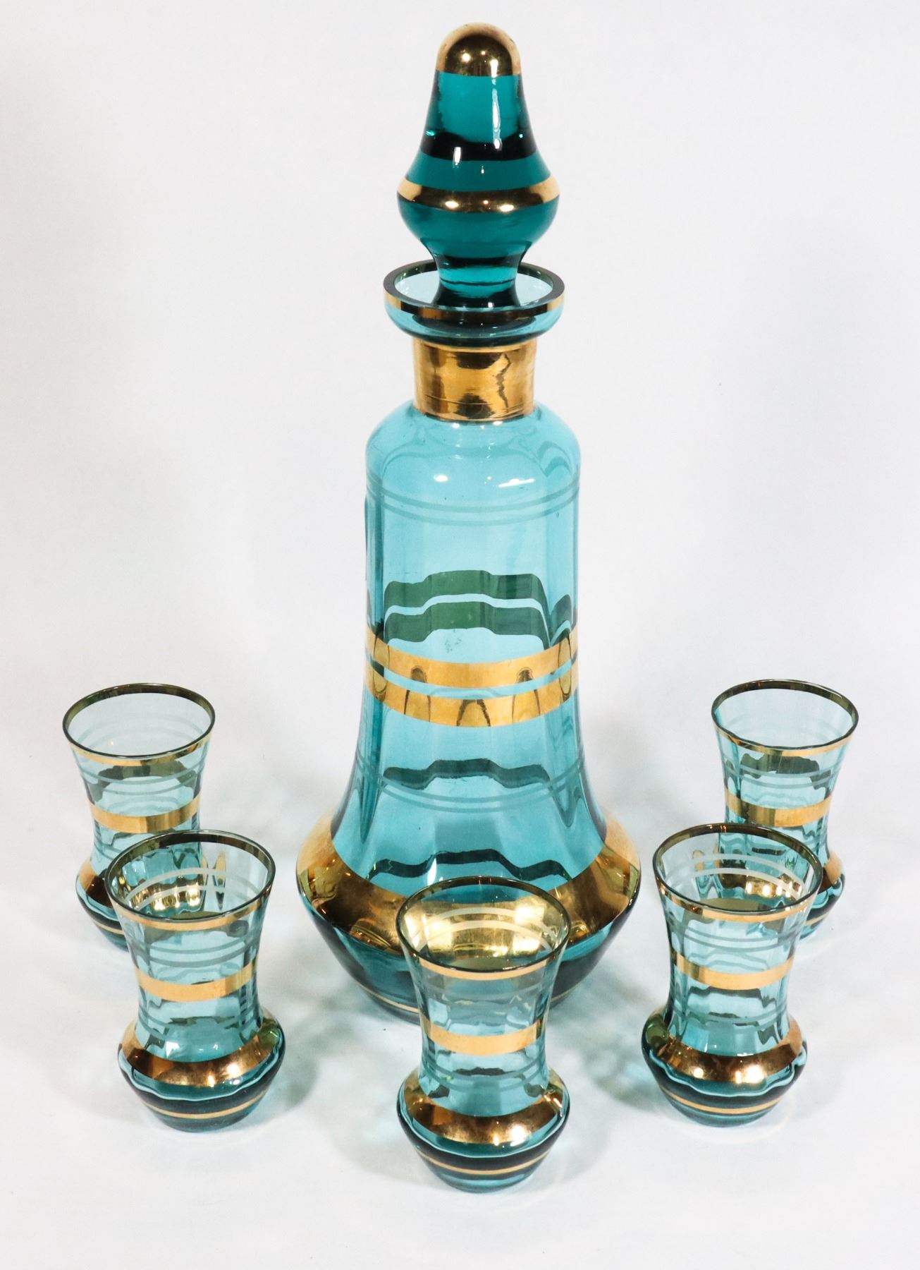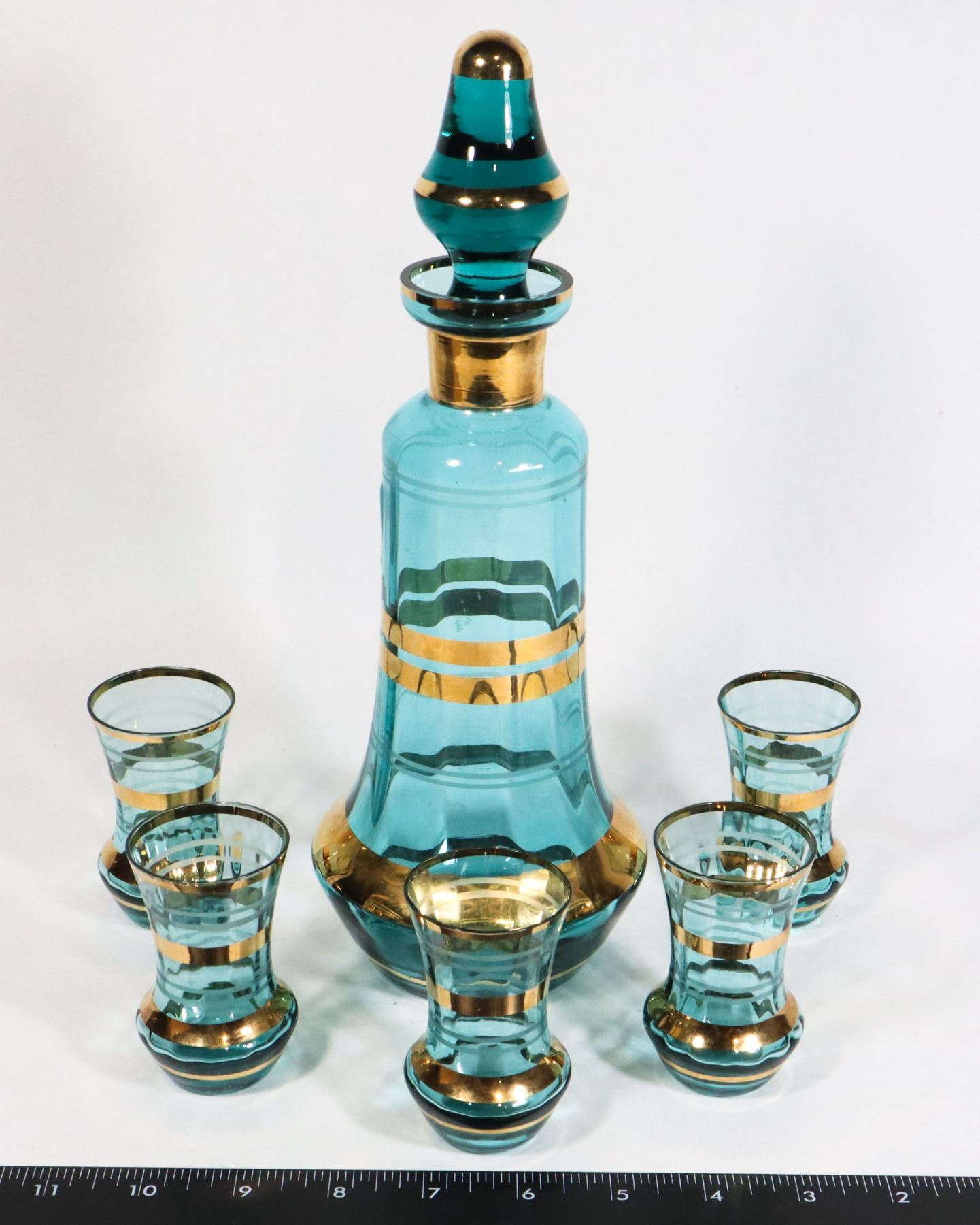 SHERRY WINE CARAFE AND SIPPING GLASSES, TEAL AND