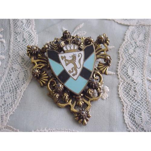 Wonderful vintage enamel costume brooch. This is a quality unsigned brooch with fabulous workmanship and style. The brooch is stunning, measuring about 2 inches by 1 ¾ inches, in excellent condition. Having a shield design with a coronet crown and enamelled lion. Fabulous to wear and add to your costume jewelry collection! If you love the Shabby Chic, Romantic Cottage, Victorian, Roses,Limoges,Barkcloth, French Lace and glamour prints such as Harrison Fisher, you may wish to book mark us since we list almost daily! Thanks & Enjoy your day!