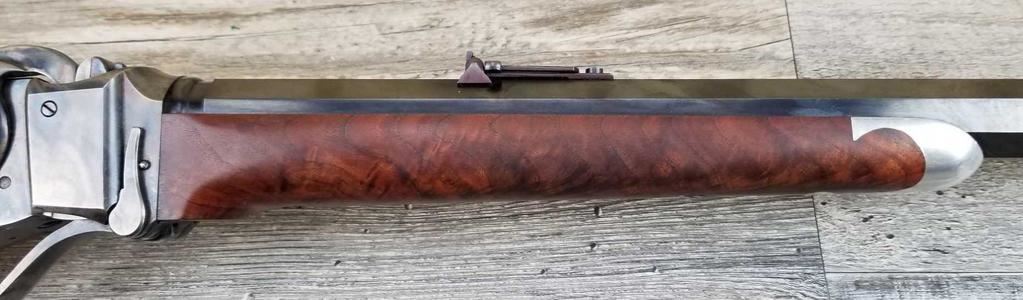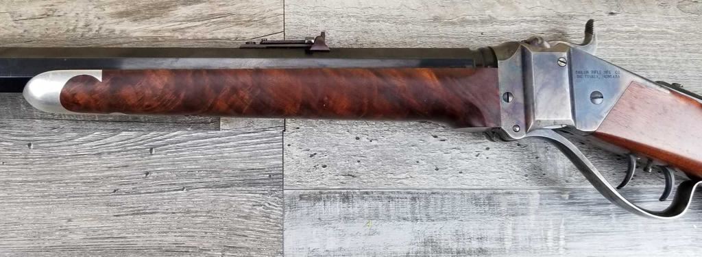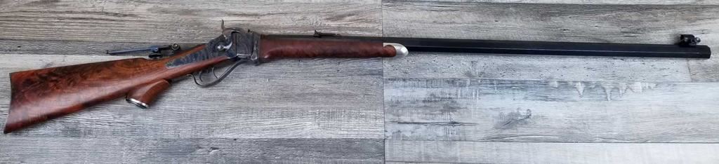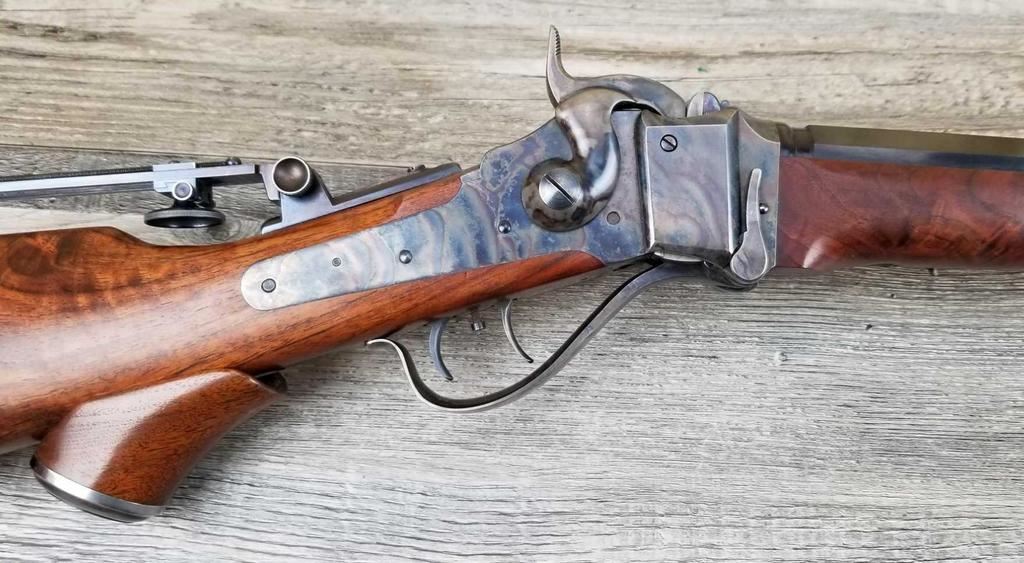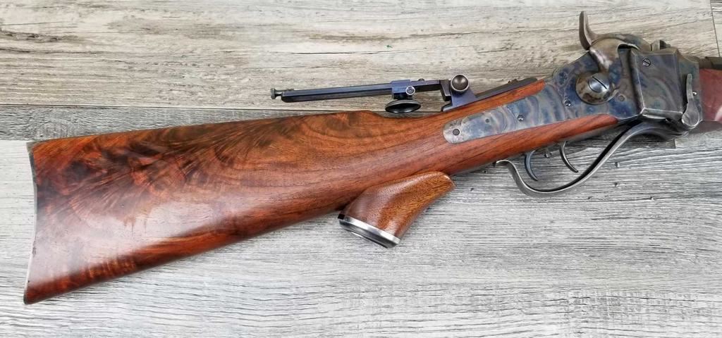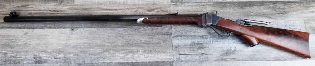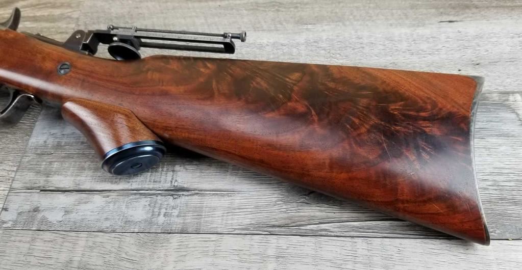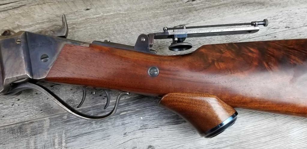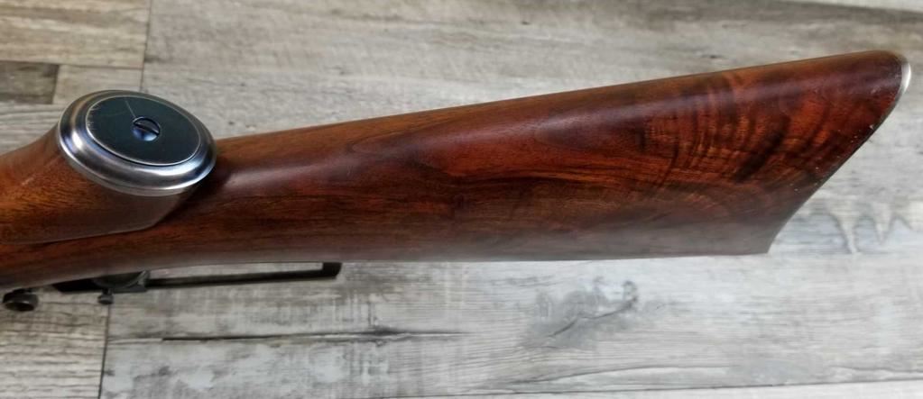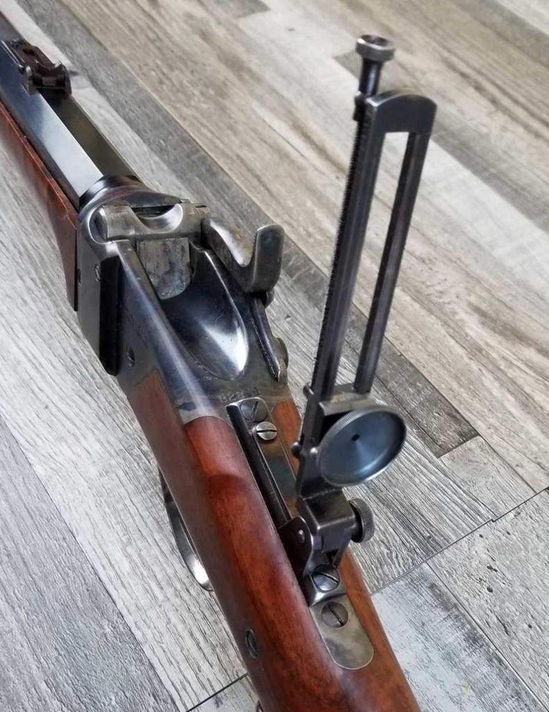 RIFLE FEATURES SPRIIT LEVEL GLOBE FRONT SIGHT, LONG RANGE VERNIER TANG SIGHT, DOUBLE SET TRIGGER AND REMOVABLE PISTOL GRIP. SHOWS ONLY THE LIGHTEST MARKS FROM HANDLING.