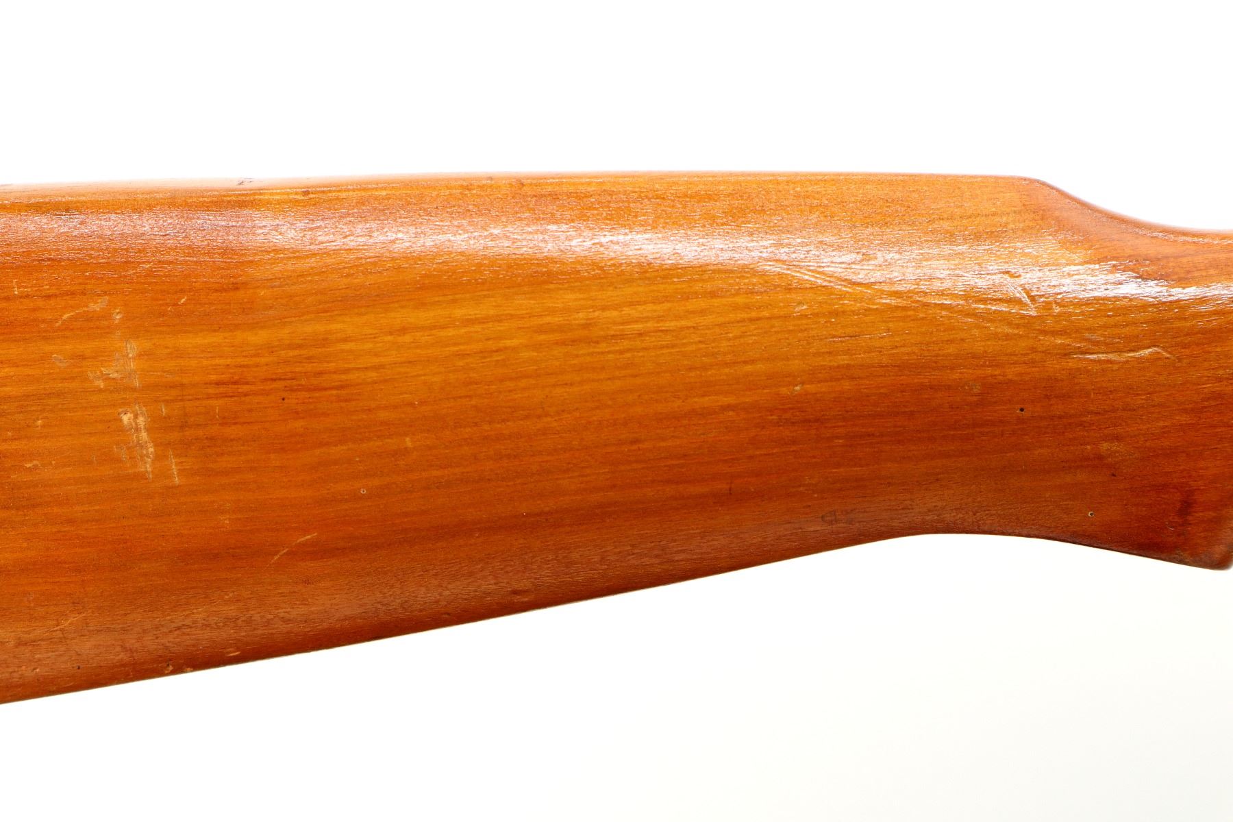Main Description: Blade front sight, u notched rear sight missing elevator, blued finish, smooth bolt knob, extractor is present. One piece wood stock, finger grooved forearm, pistol grip, grooved butt.