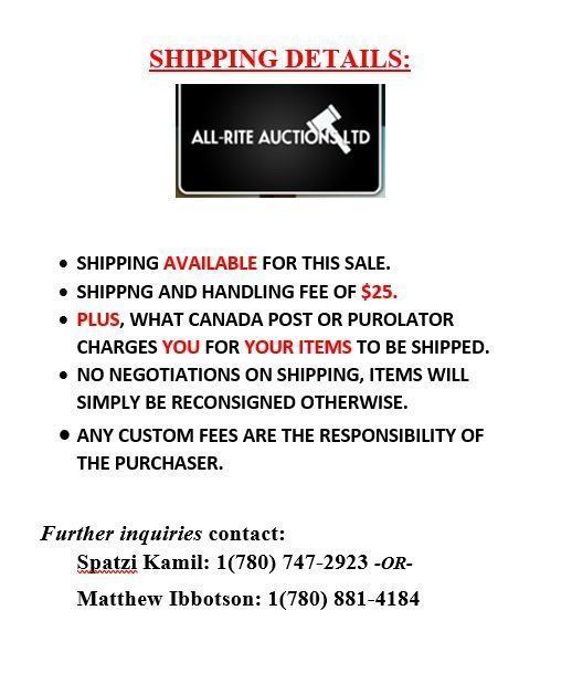 It is the purchaser's sole responsibility to make any necessary inquiries and to inspect the item before placing a bid. Viewing is available by appointment, please contact All-Rite Auctions at 1-780-747-2923 or 1-780-881-4184.