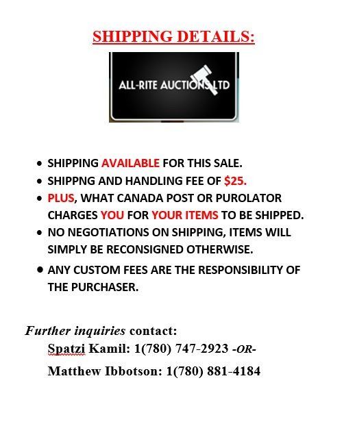 It is the purchaser's sole responsibility to make any necessary inquiries and to inspect the item before placing a bid. Additional viewing is available by appointment, please contact All-Rite Auctions at 1-780-747-2923 or 1-780-374-3864.