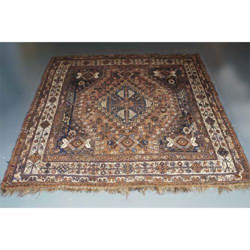 1 SHIRAZ CARPET 5'7"x 6'6" early 20th century- 3" hole at center, wear