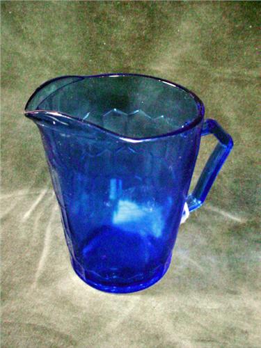 SHIRLEY TEMPLE COBALT BLUE GLASS PITCHER 4.5" DEPICTING FAINT IMAGE OF SHIRLEY ON SIDE OF ITEM.