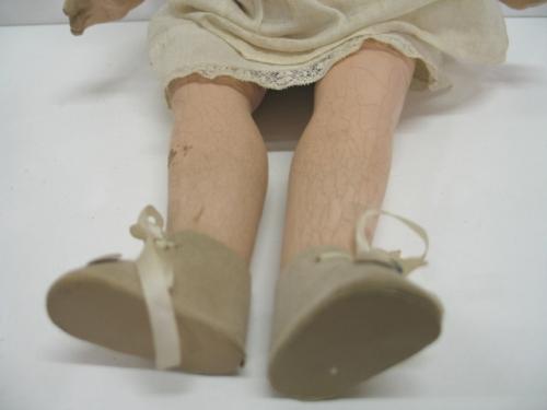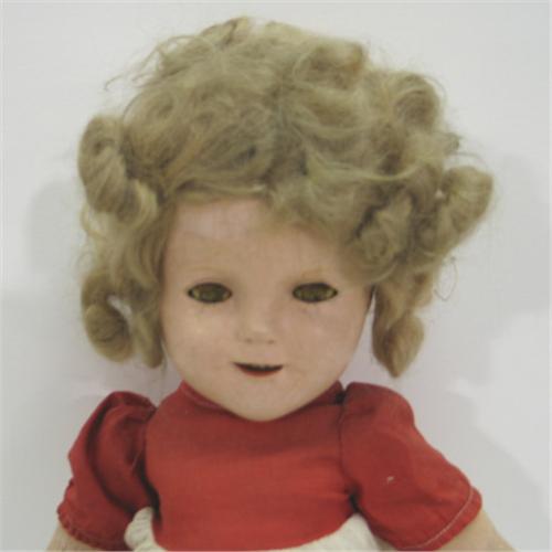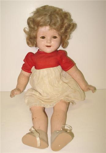 SHIRLEY TEMPLE DOLL. No mark. Composite body. Movable arms and legs. Body and face shows signs of crazing. Glass eyes show signs of crazing. In need of cleaning. 18.5” H