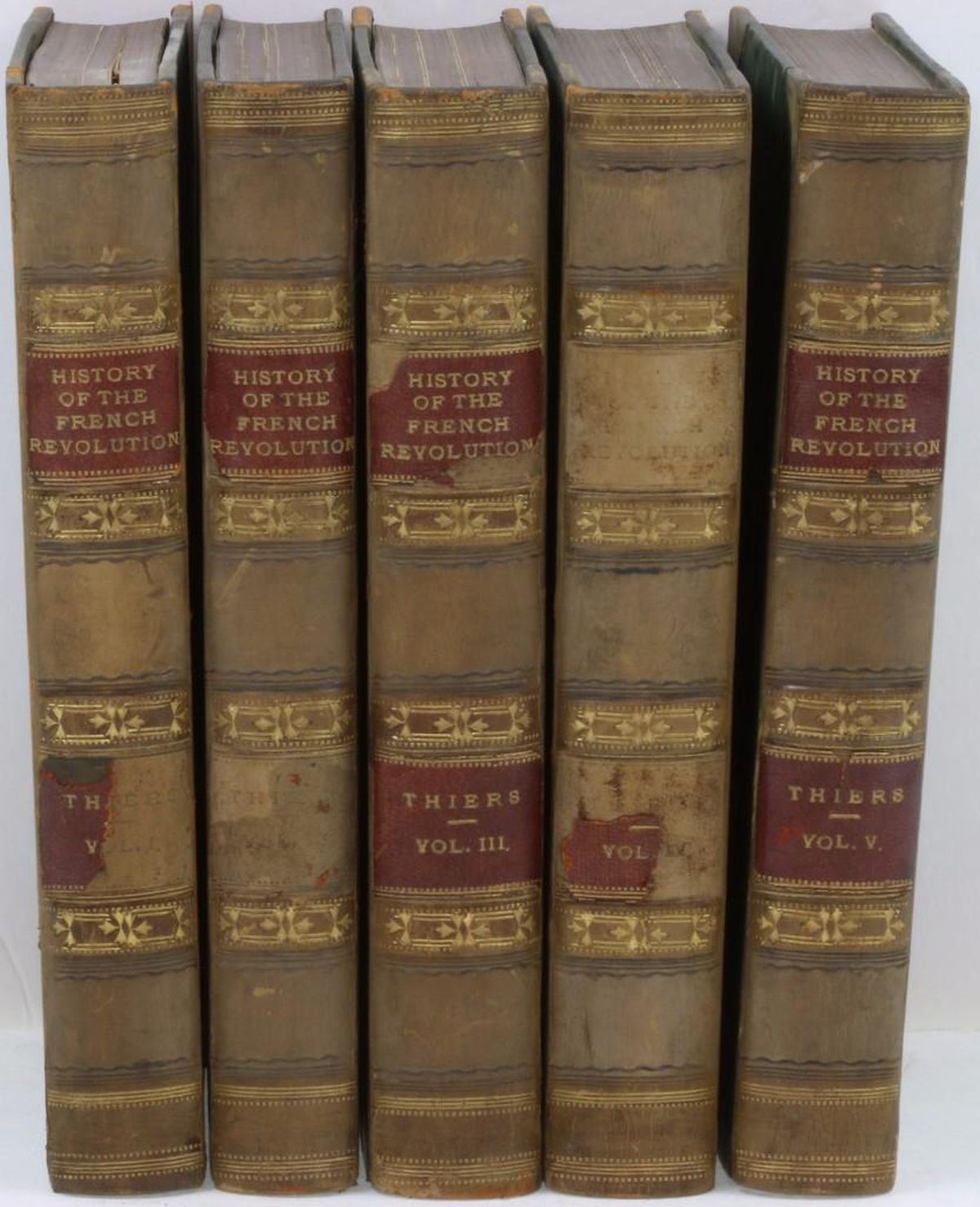 SHOBERL. The History of the French Revolution. 5 volumes. 1838. Shoberl, Frederick. The History of the French Revolution. London: R. Bentley, 1838. 5 volumes. Uniformly bound in half green polished calf gilt. Spine labels chipped, spines toned, occasional spotting, shelfwear. Provenance: William Hetherington with his bookplates.