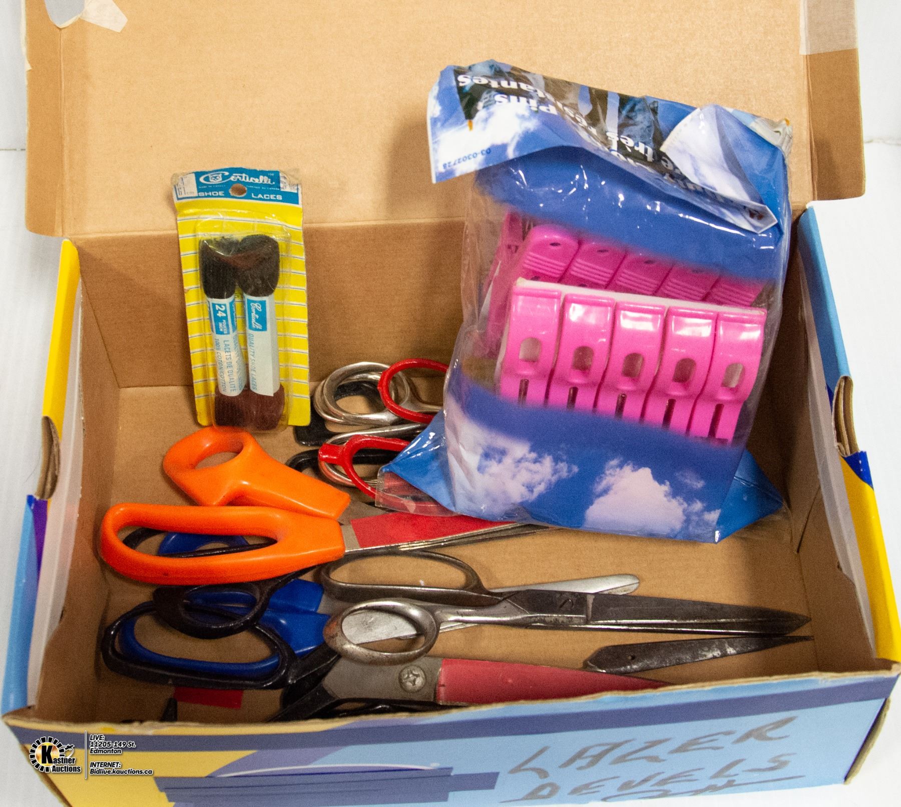 SHOE BOX FULL OF SCISSORS, SHOE LACES & CLOSEPINS