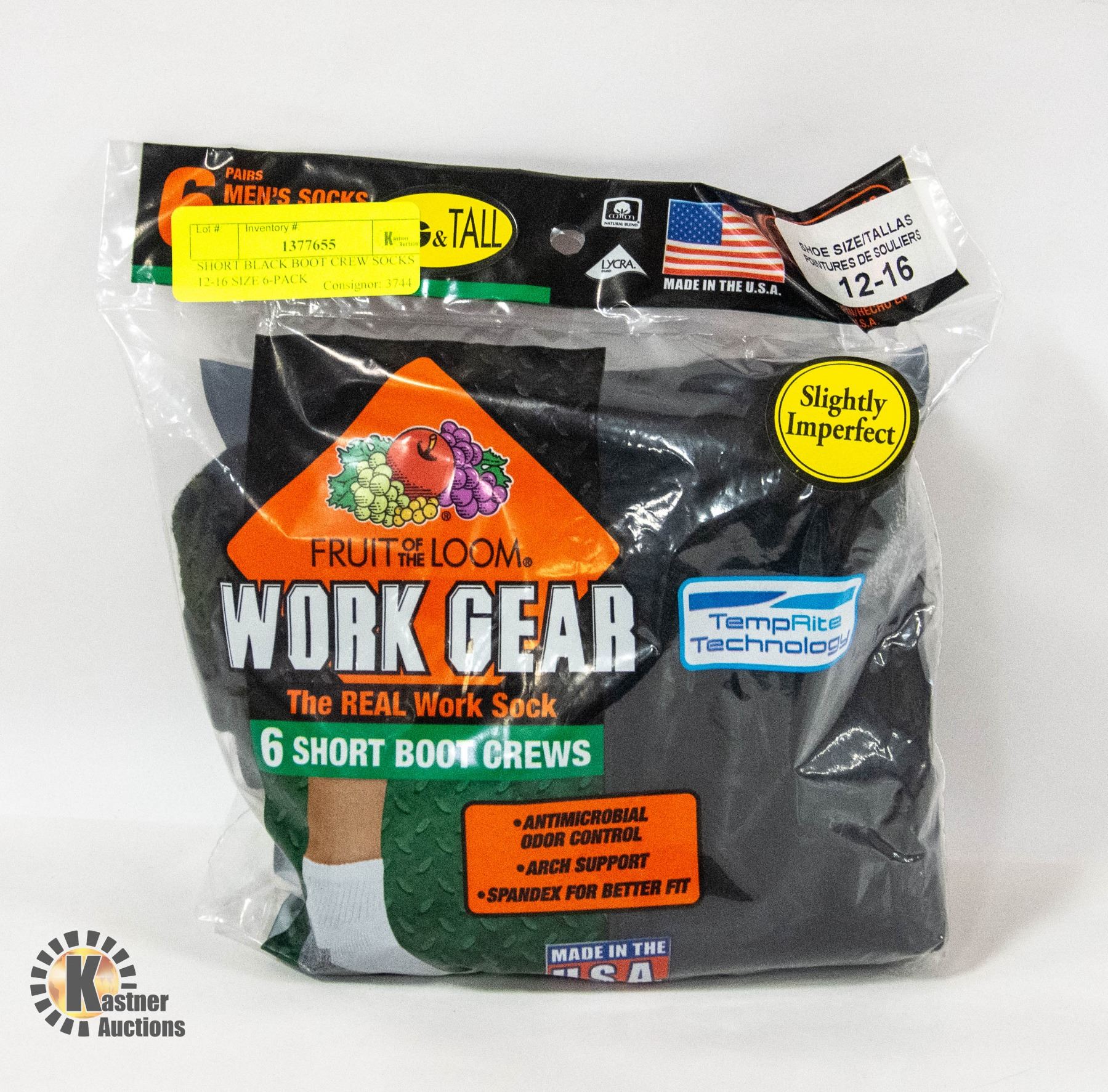 SHORT BLACK BOOT CREW SOCKS 12-16 SIZE 6-PACK