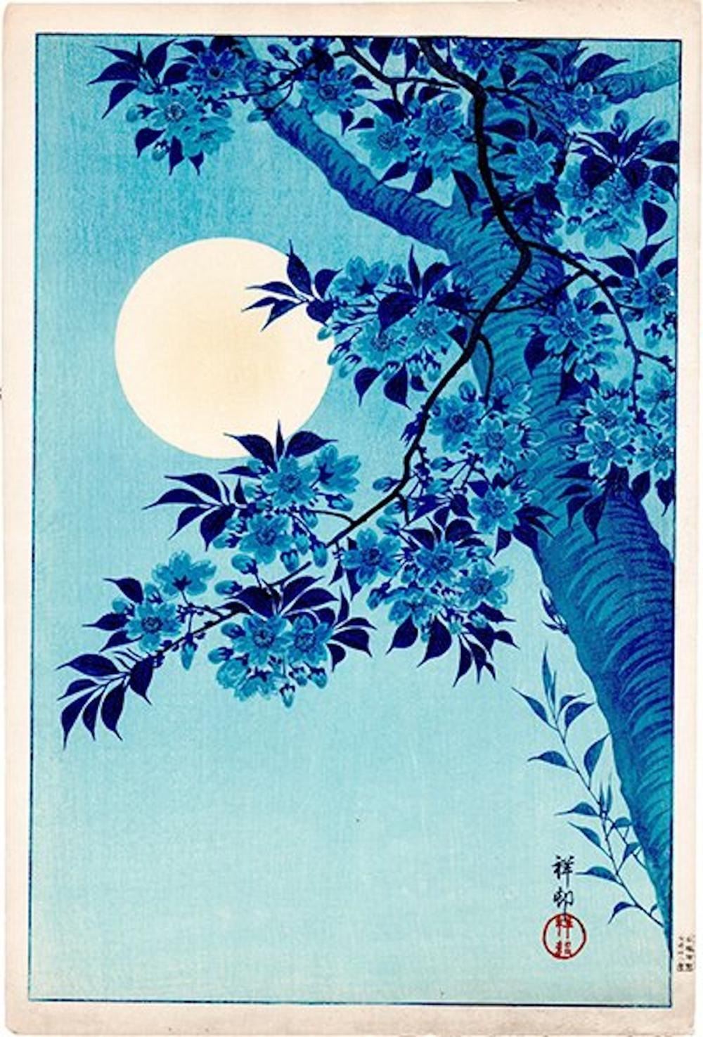 SHOSON. "MOON AND CHERRY".FIRST EDITION RARE,PUBLISHER: WATANABE. WATANABE COPYRIGHT SEAL ON LOWER RIGHT MARGIN ( FIRST EDITION ), OBAN, 15 2/8 X 10.5. FINE CONDITION