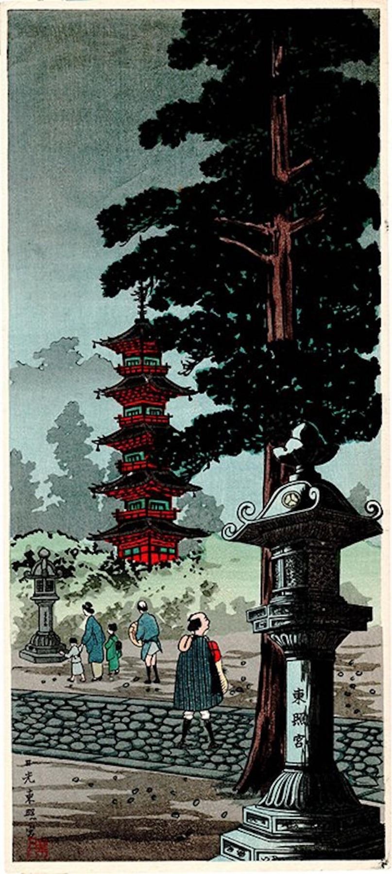 SHOTEI - "FIGURE BY TEMPLE" , MITSUGIRI BAN, CIRCA 1930, 15 3/8 X 7/1/4. VERY GOOD CONDITION