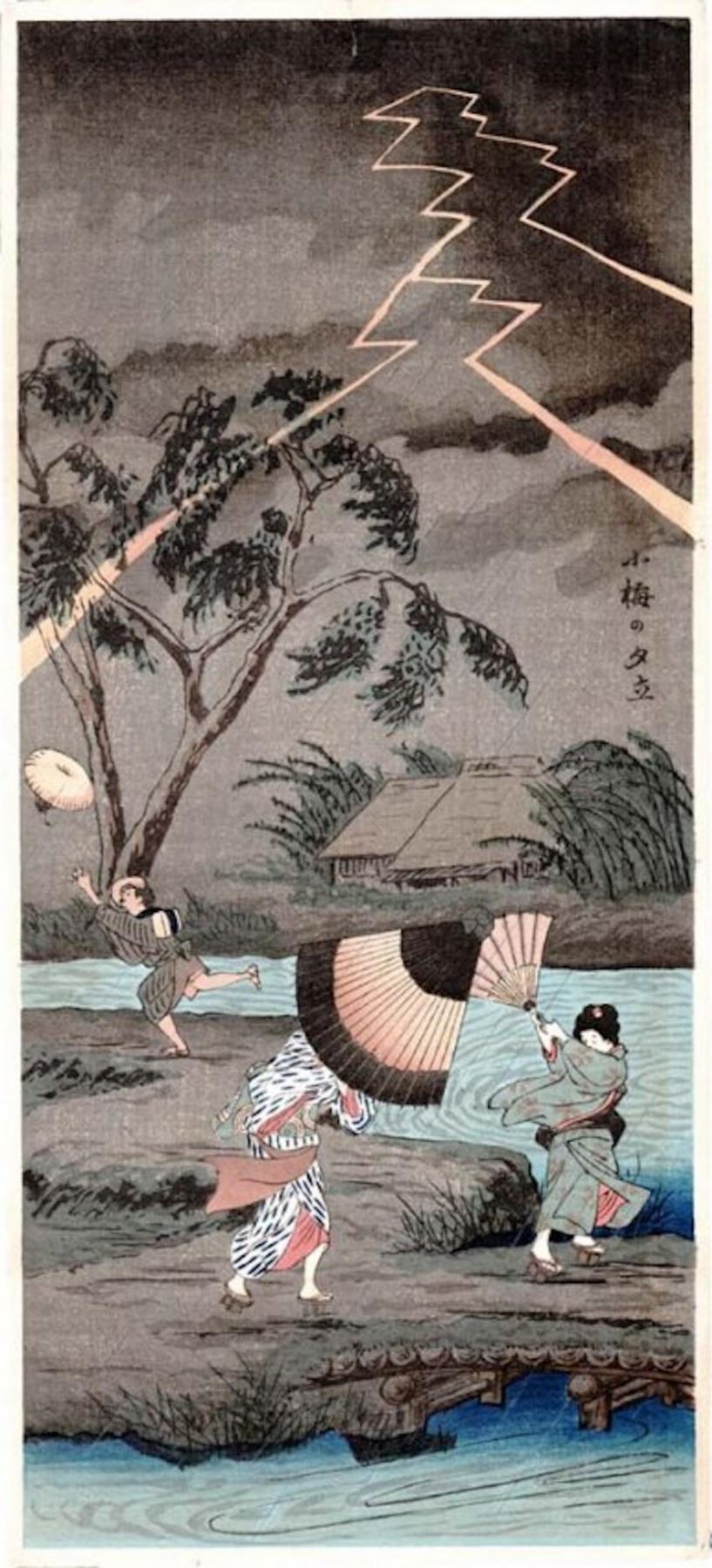 SHOTEI - "THREE WOMEN UNDER A LIGHTNING STORM", MITSUGIRI BAN, CIRCA 1930, 15 3/8 X 7/1/4. VERY GOOD CONDITION