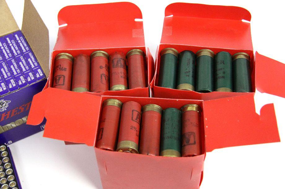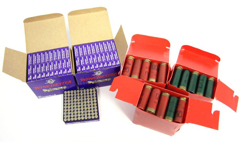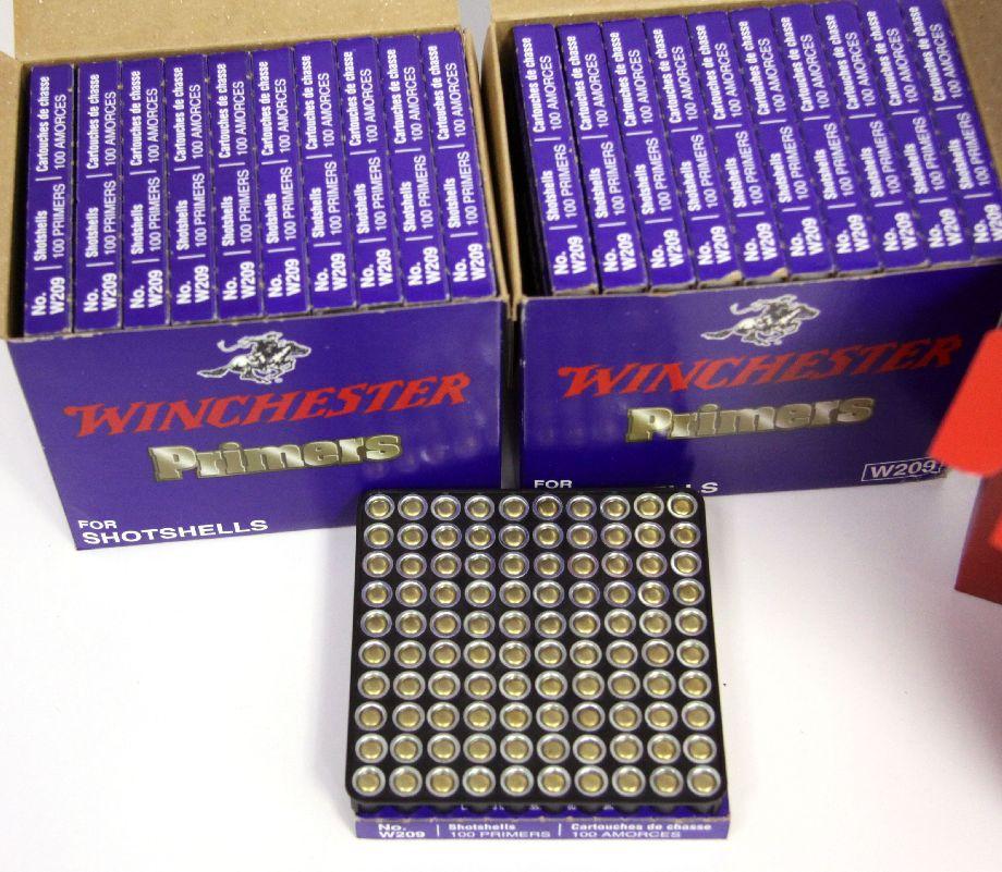 Winchester shot shell reloading primers. Two cases 1000 pcs ea, plus one additional box of 100. Also included are 3 boxes of reloaded 12 gauge shot shells (75 shells total).