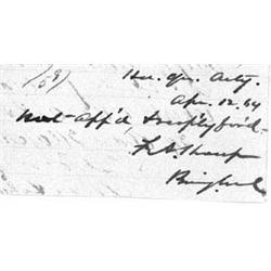 (1834-1896) Confederate brigadier general who served as Johnston's chief of artillery during the Atlanta campaign and Hood's chief of staff during the Nashville campaign. War-date closely-cut signature adding rank  ""F. A. Shoup Hd. Qrs. Art'y. Apr. 12, 1864"", removed from document. Very good.