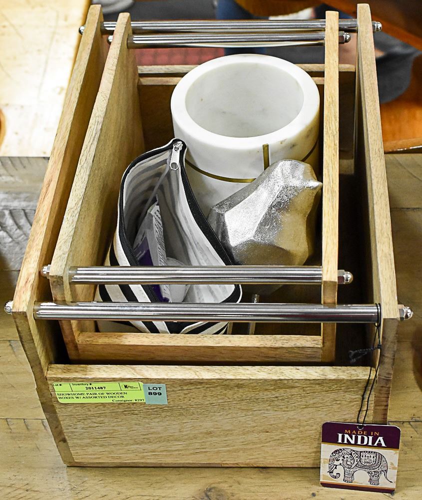 SHOWHOME PAIR OF WOODEN BOXES W/ ASSORTED DECOR