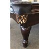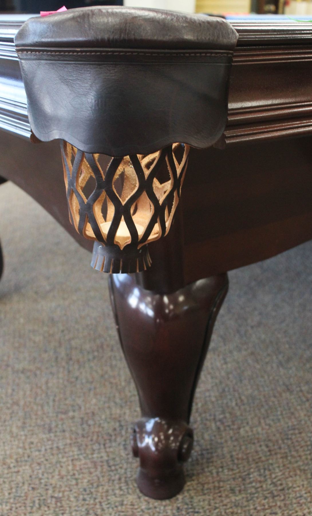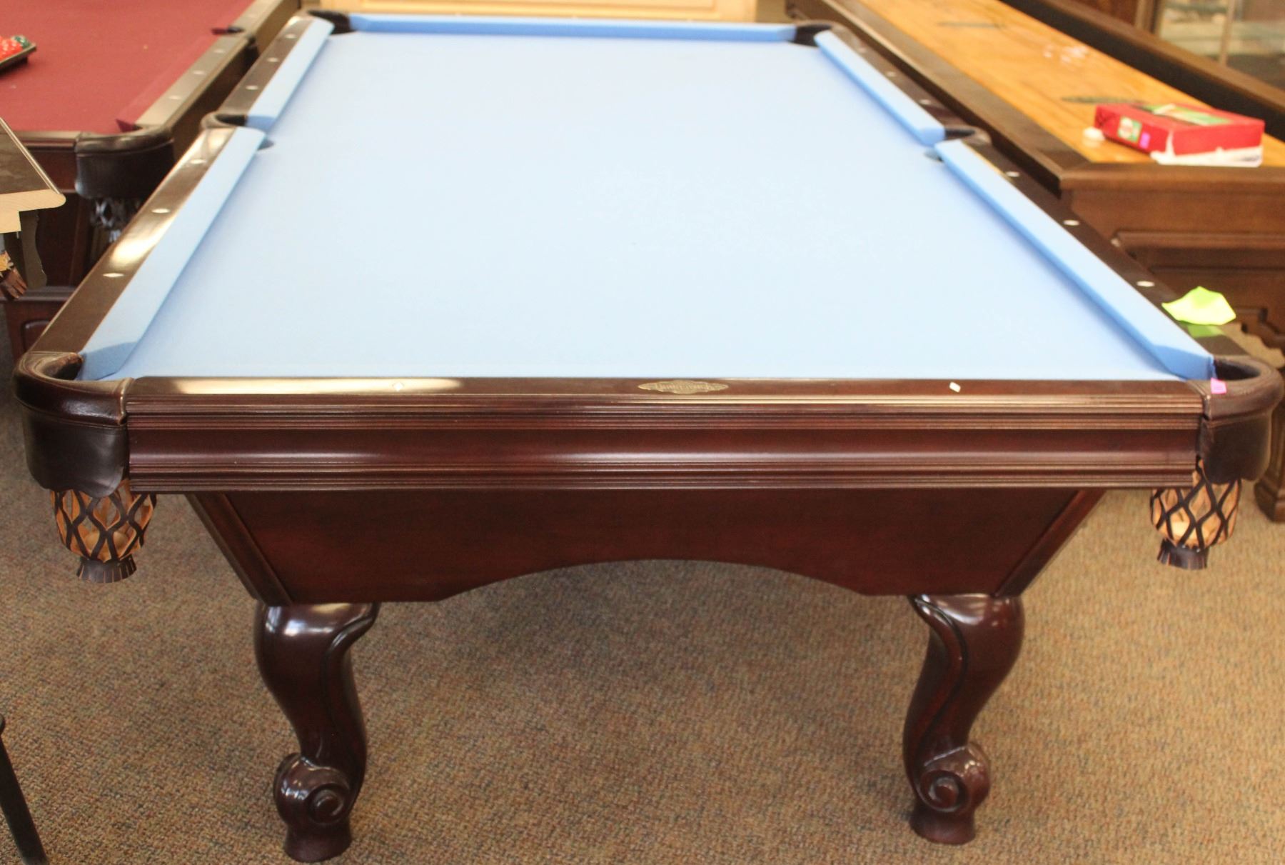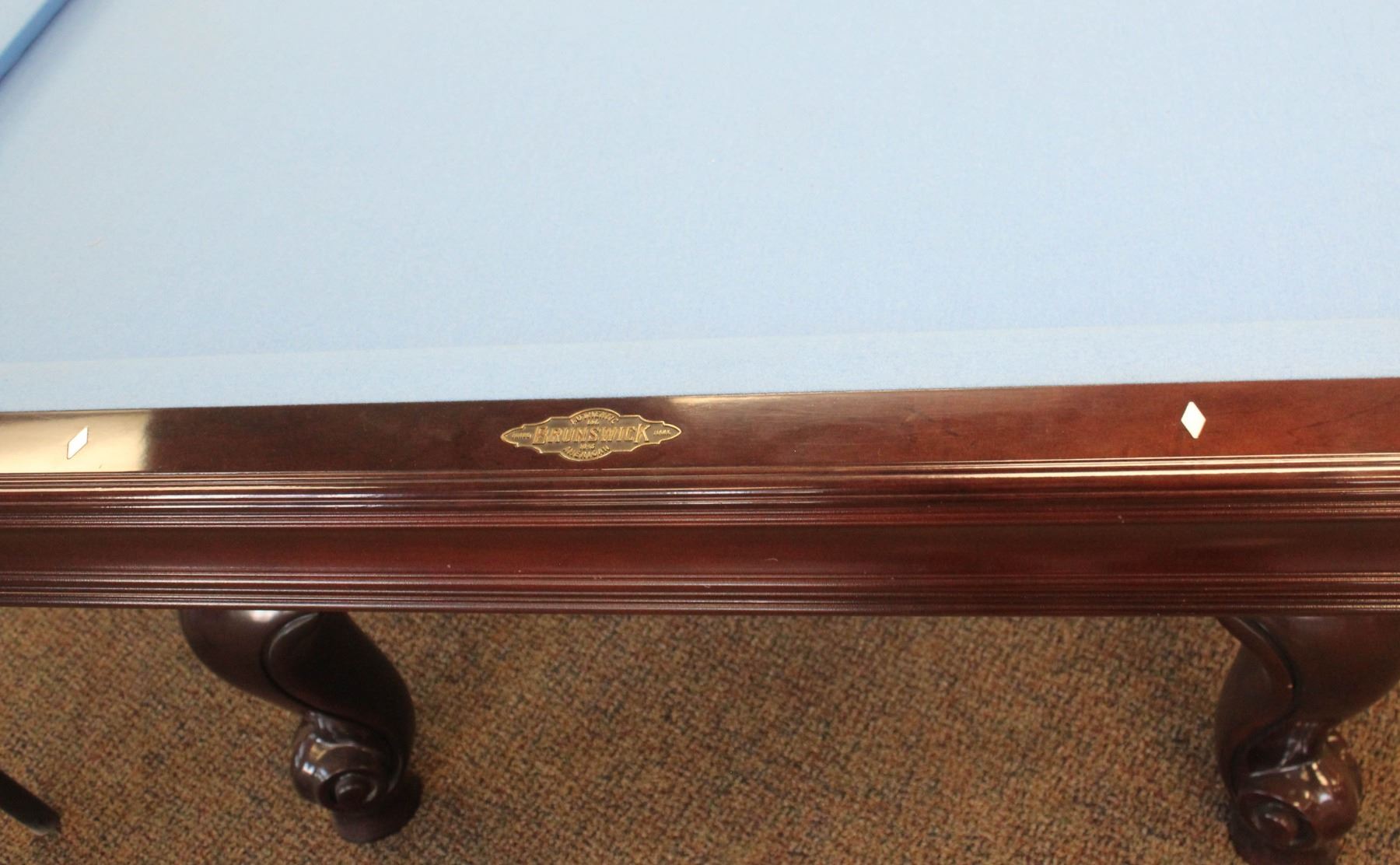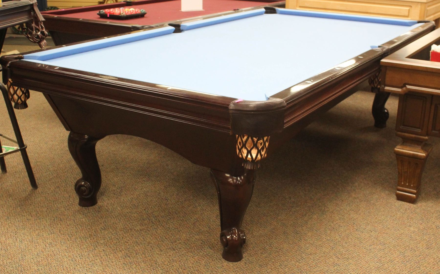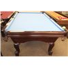 BLUE FELT TOP/ DARK BROWN WOODEN BASE AND ACCENTS. LEATHER BRAIDED POCKETS & IVORY INLAID DIAMOND SIGHTS. 110' X 59.5' * ALL LARGE GAME TABLES ARE TO BE REMOVED BY THE BUYER OR PROFESSIONAL BILLIARD MOVERS UPON PURCHASE*