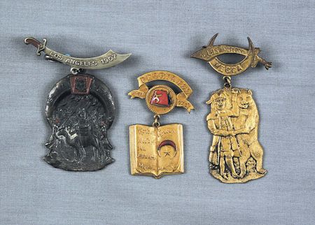 Excellent lot of three badges issued by the Ancient Order of the Nobles of the Mystic Shrine (Shriners) in 1907, including a Peoria, Illinois, 1907, gorgeous two-part bronze badge with enameled fez and crescent moon. Second part depicts the Koran with the caption "Allah al Allah...Mohammed". Bright gold finish, issued by the ACME Badge Co. Along with: a 1906 San Francisco attached to a 1907 sword with raised lettering marked Los Angeles. Exceptional detail of Shiners as firemen, with hoses in hand and camel as a fire vehicle with vat of water attached to its hump with connecting hoses, fighting the devastating fires caused by the San Francisco earthquake. Outstanding detail! Above the burning buildings is the crescent moon with "Islam" and "San Francisco", in raised lettering, partly enameled, cast by W.D. Vanderslice. Finally, there is a two-part bronze badge with gold finish marked Los Angeles, Mecca, 1907, with sword encompassing the crescent moon, attached to a second medal featuring a Shriner dressed in colonial American garb embracing a bear with the "secret" handshake. An exceptional lot that should be examined.