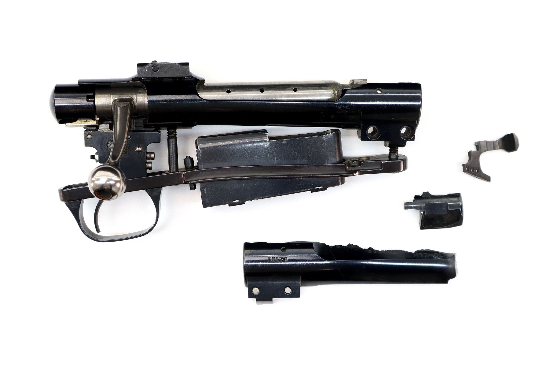 Main Description: This rifle has a broken receiver, damaged bolt and barrel extension, being sold as parts only. Includes: trigger mech and bent trigger guard. Blued finish, missing small parts and complete stock assembly.