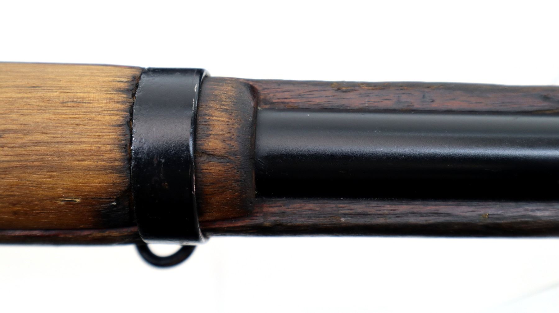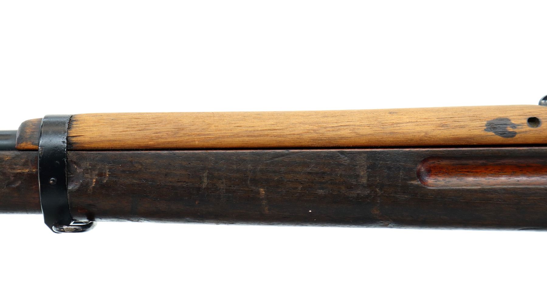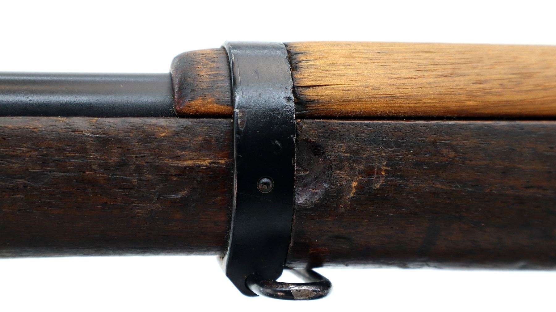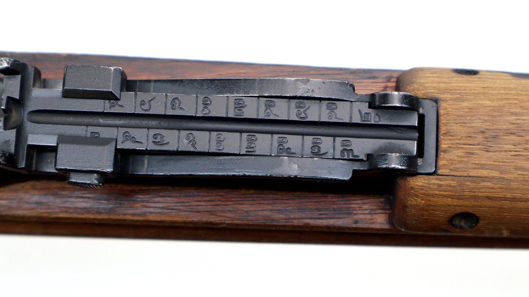 Main Description: Barley corn front sight with ramp, adjustable u notched rear sight, black painted metal finish, Siamese crest on receiver ring, straight bolt handle missing dust cover. Two piece full military wood stocks, handguard is cracked, finger grooved forearm, pistol grip, smooth steel butt plate, sling swivels, cleaning rod, bayonet lug, missing front nose cap screw.