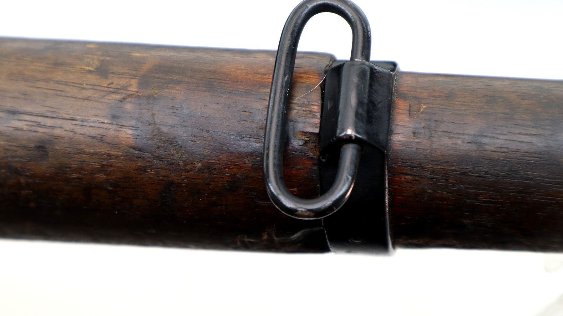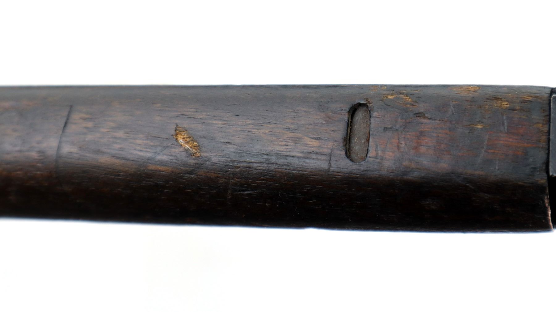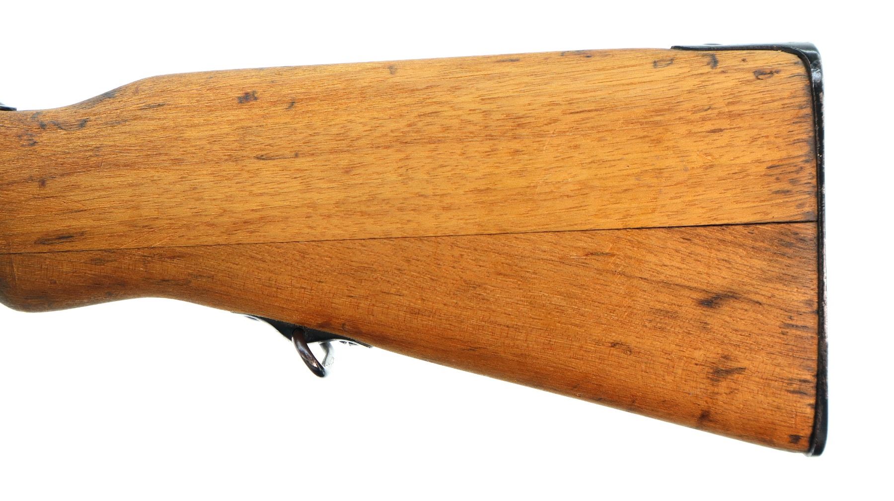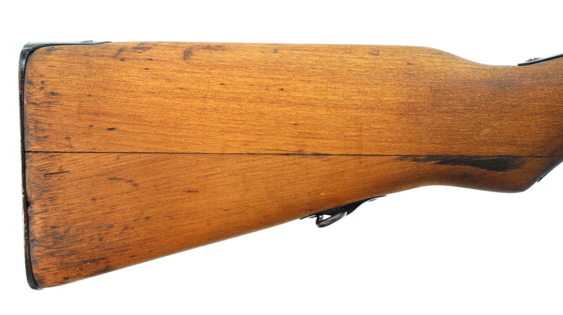 Main Description: Barley corn front sight with ramp, adjustable u notched rear sight, black painted metal finish, Siamese crest on receiver ring, straight bolt handle missing dust cover. Two piece full military wood stocks, handguard is cracked, finger grooved forearm, pistol grip, smooth steel butt plate, sling swivels, cleaning rod, bayonet lug, missing front nose cap screw.