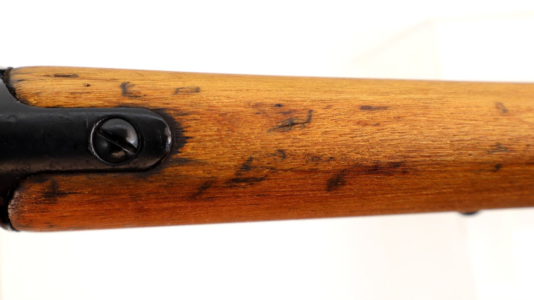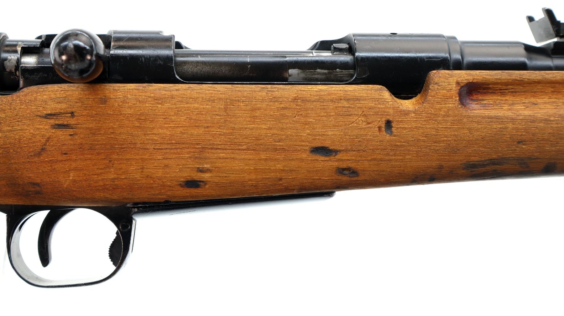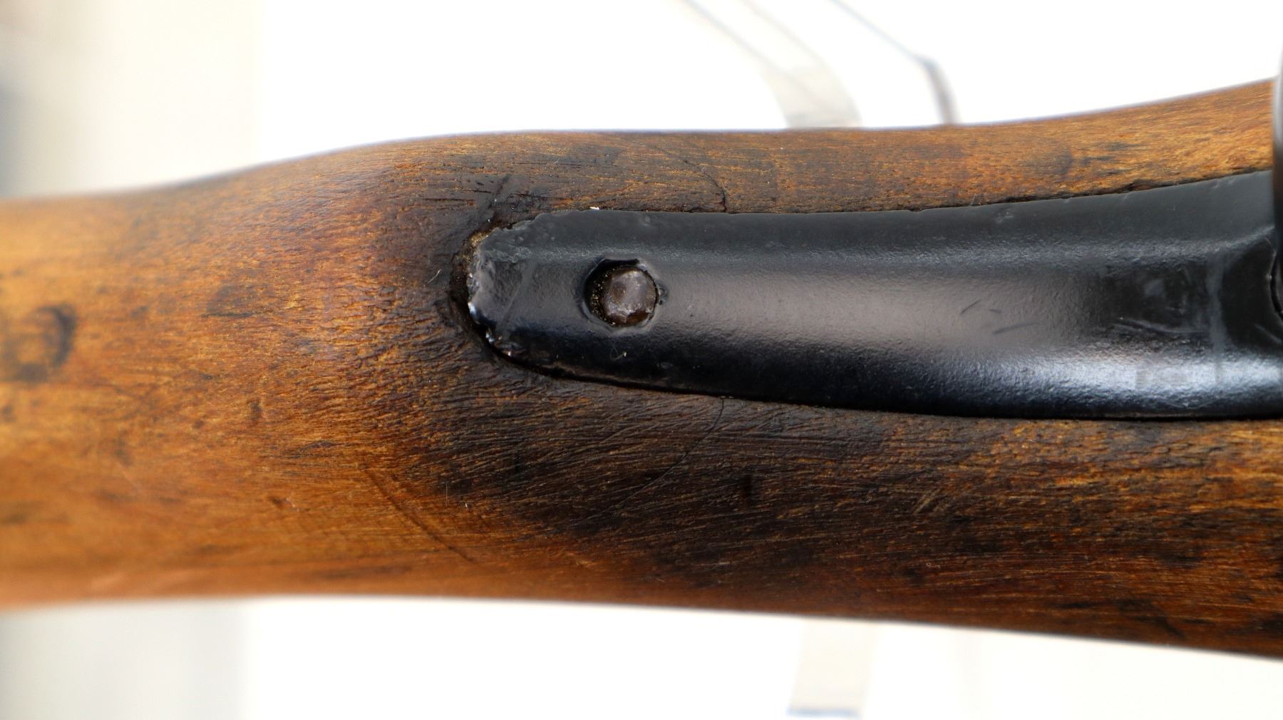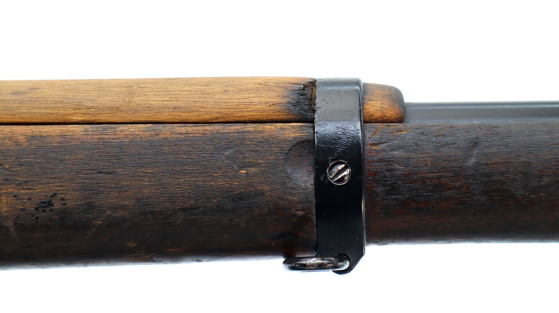 Main Description: Barley corn front sight with ramp, adjustable u notched rear sight, black painted metal finish, Siamese crest on receiver ring, straight bolt handle missing dust cover. Two piece full military wood stocks, handguard is cracked, finger grooved forearm, pistol grip, smooth steel butt plate, sling swivels, cleaning rod, bayonet lug, missing front nose cap screw.