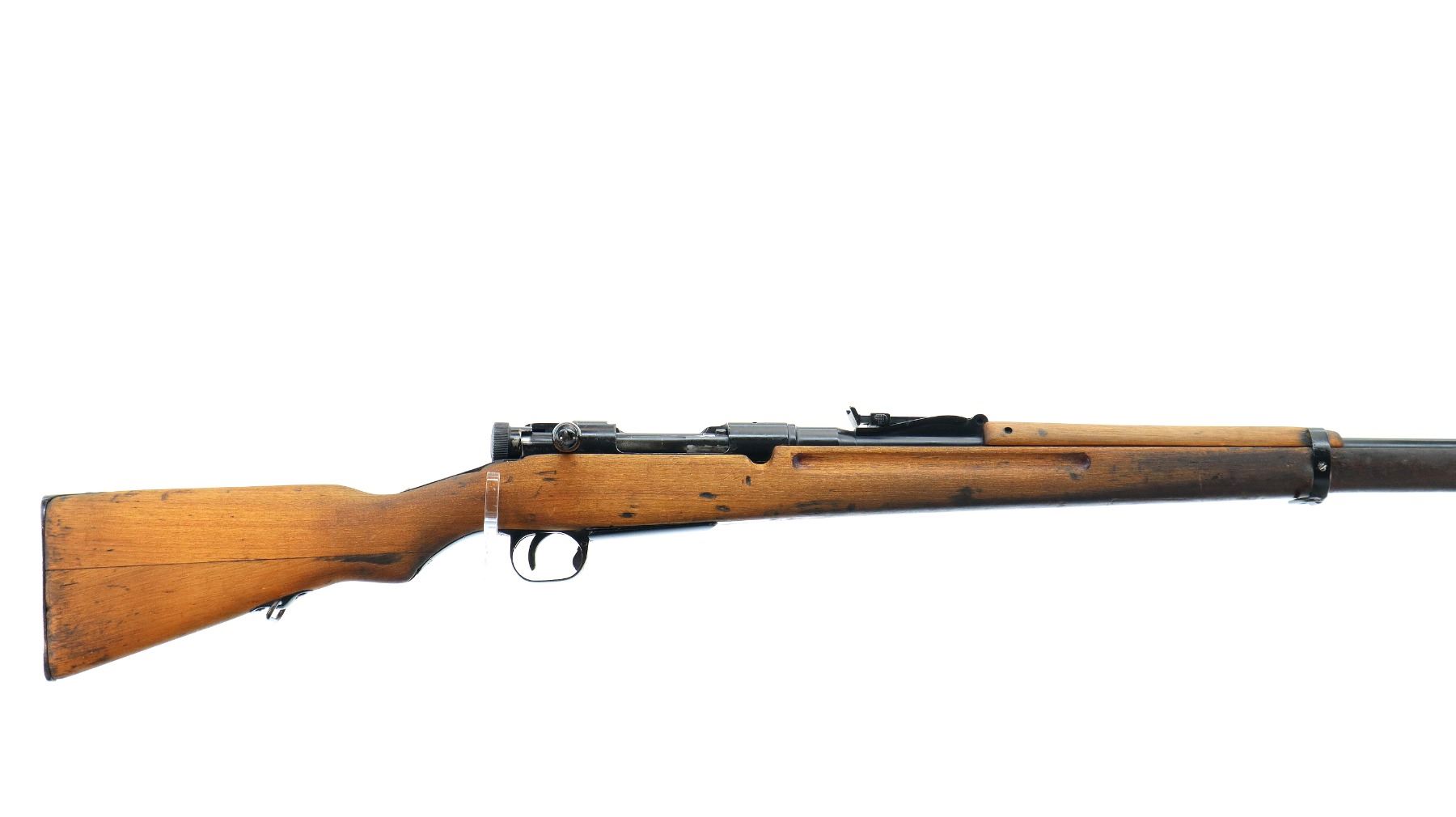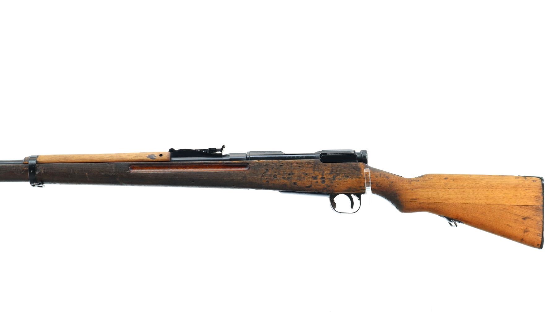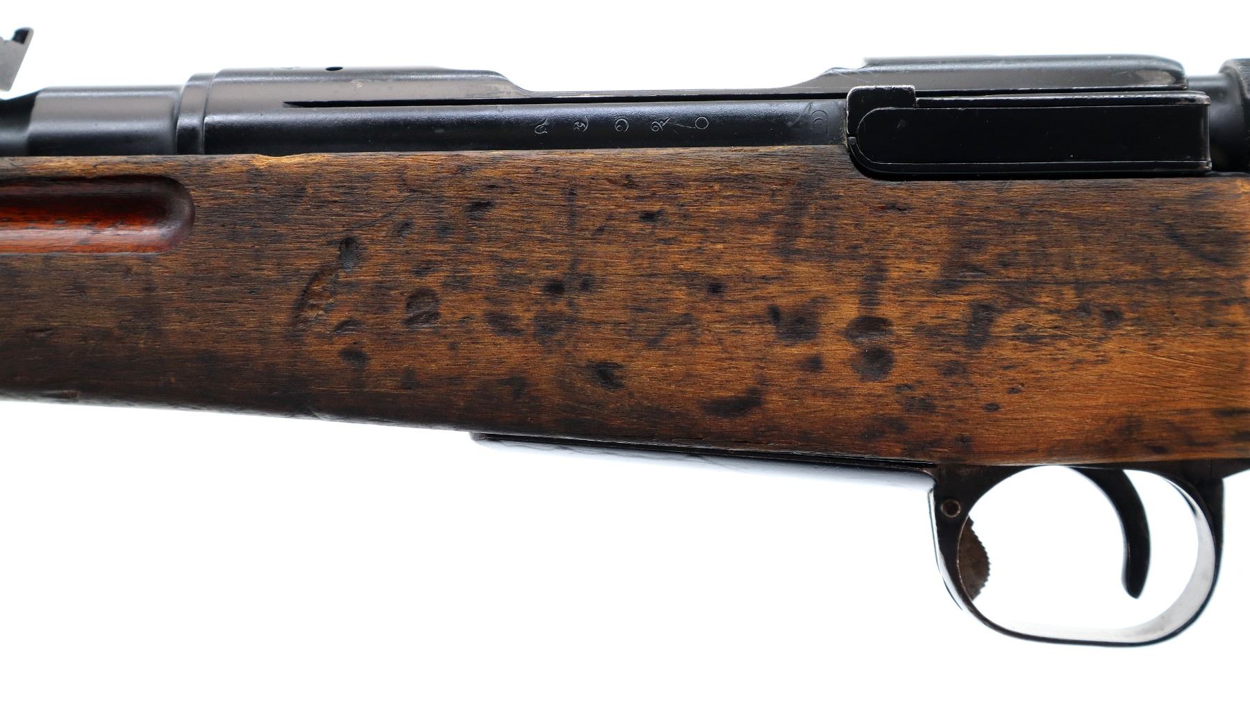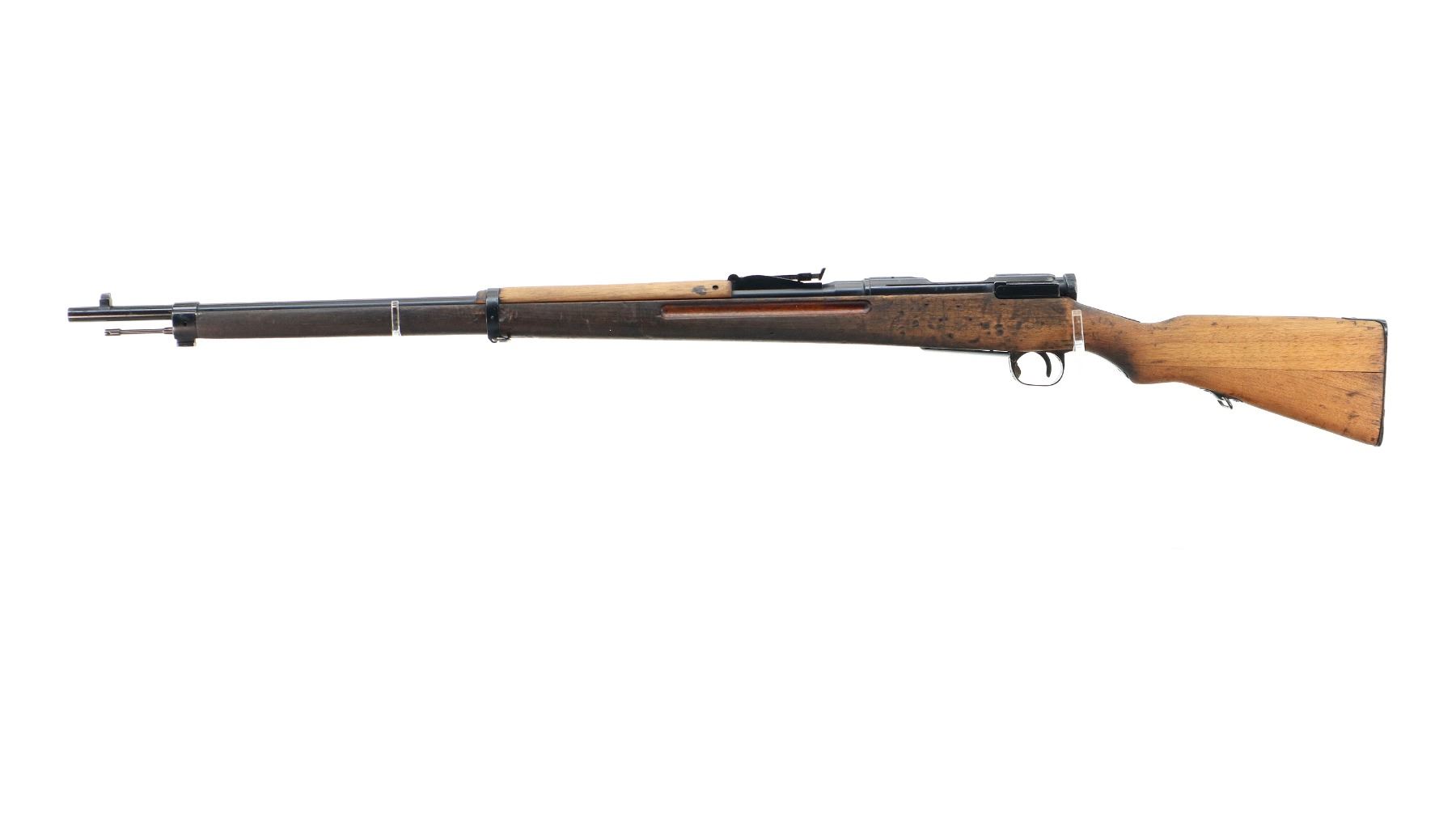 Main Description: Barley corn front sight with ramp, adjustable u notched rear sight, black painted metal finish, Siamese crest on receiver ring, straight bolt handle missing dust cover. Two piece full military wood stocks, handguard is cracked, finger grooved forearm, pistol grip, smooth steel butt plate, sling swivels, cleaning rod, bayonet lug, missing front nose cap screw.