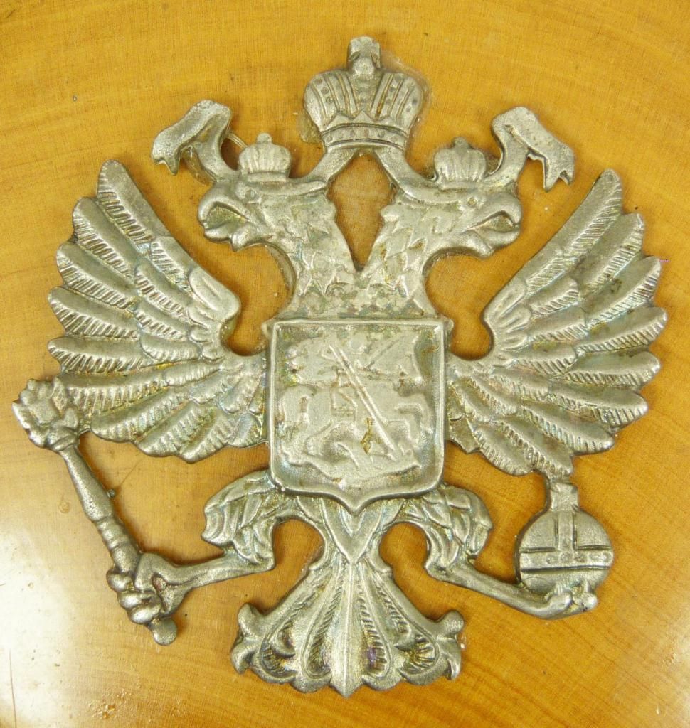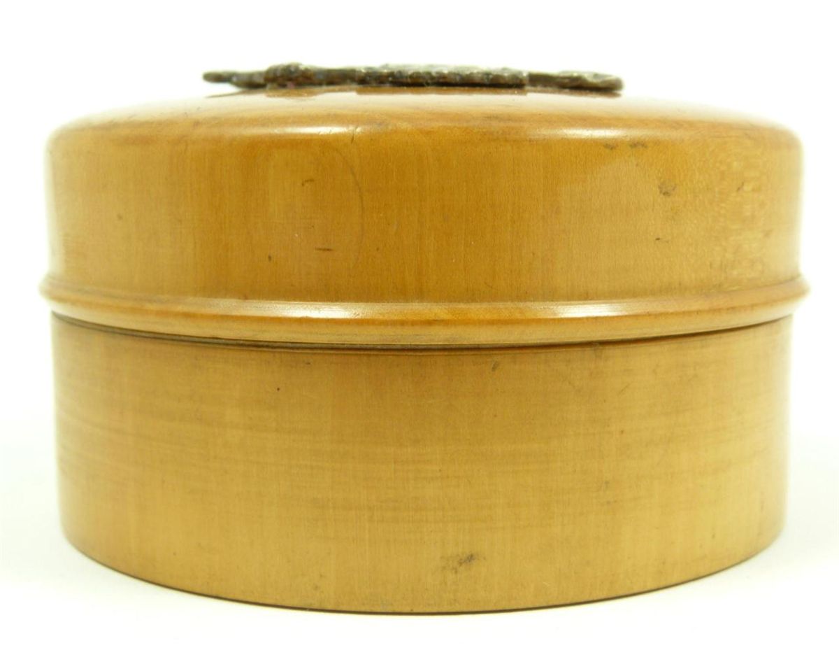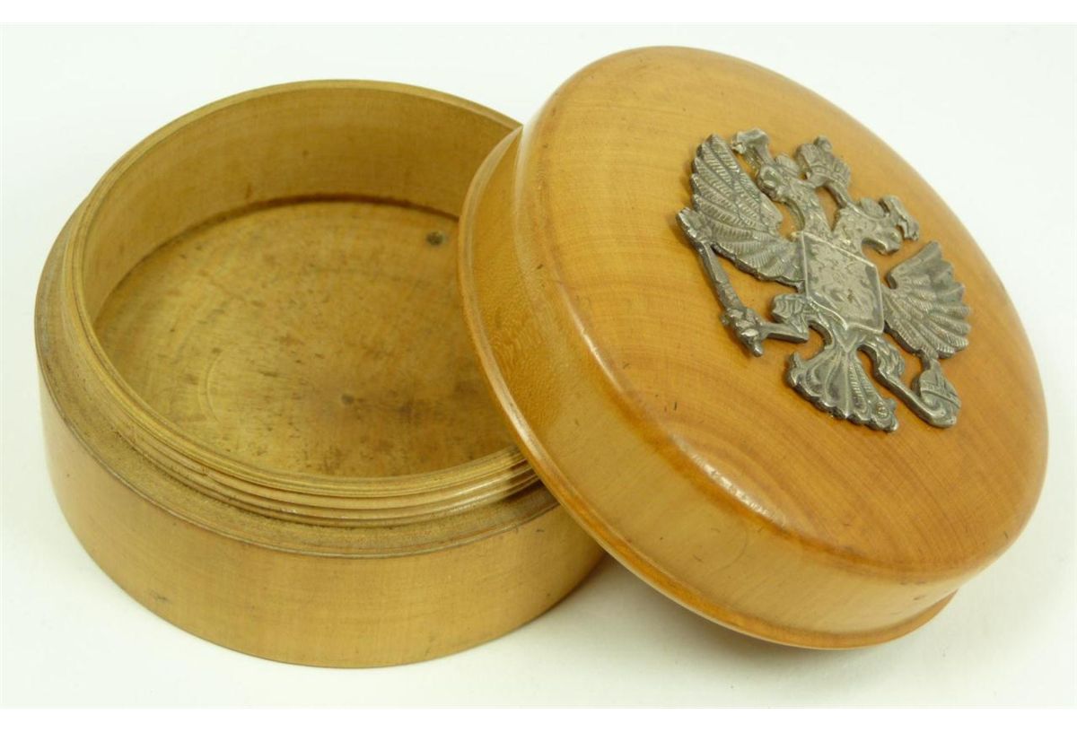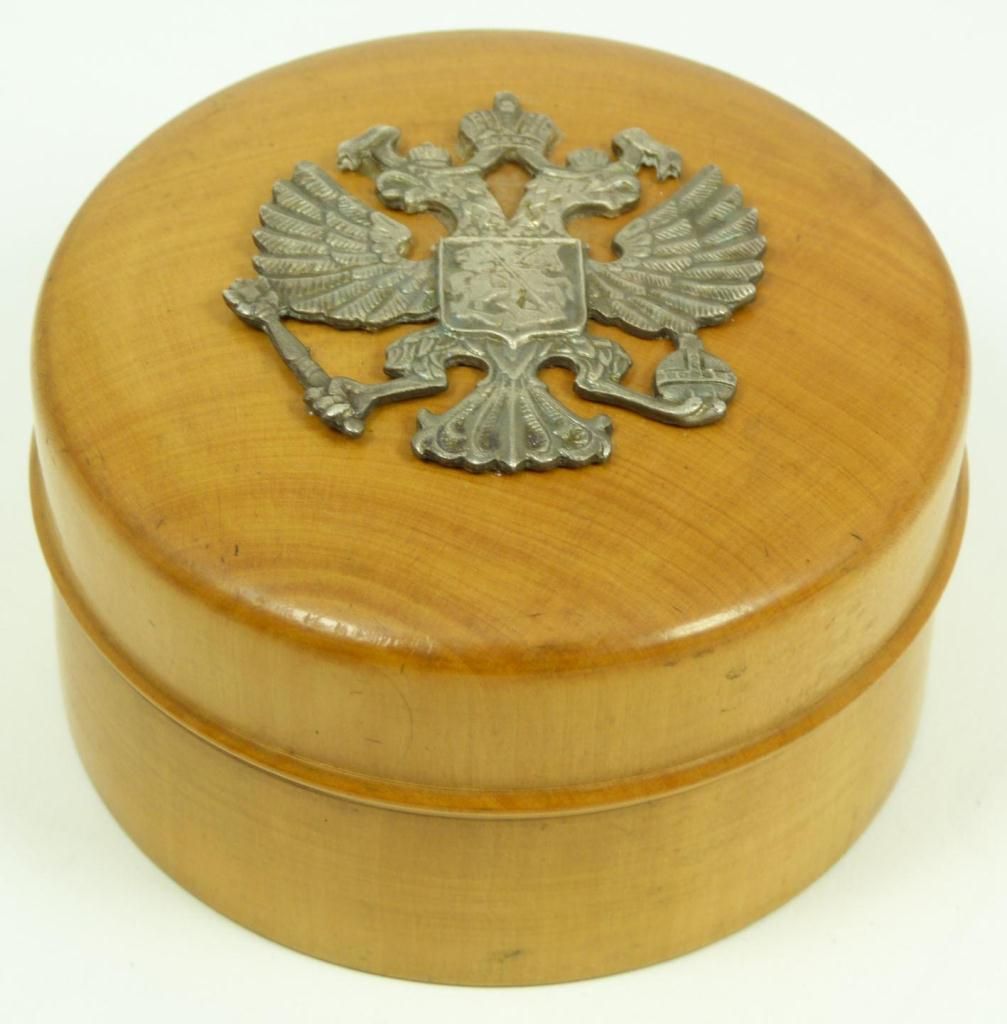 Russian Siberian birch wood round covered box having a silver double headed eagle coat of arms applique to top of cover. Mid to early 20th century. Measures 2 1/8" height x 3 5/8" diameter (5.4cm x 9.2cm). Total weight of 129 grams.
