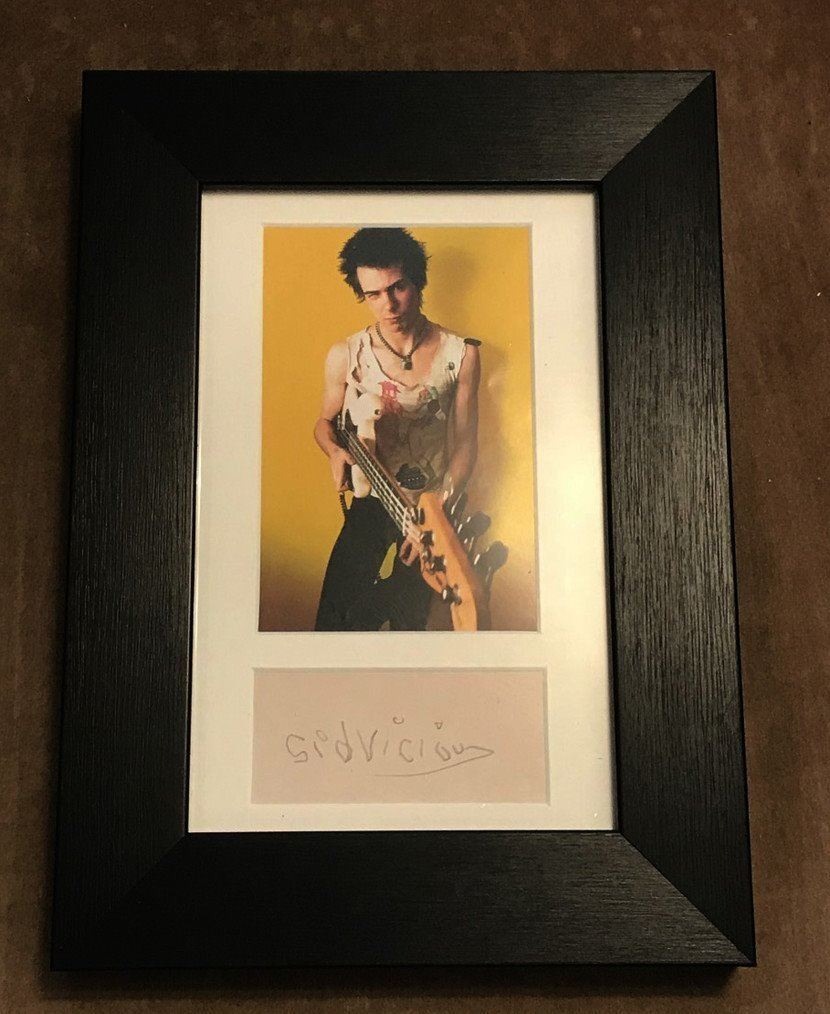 Vicious had risen to notoriety after joining the Sex Pistols in 1977, replacing the punk band?s original bass player. During the Sex Pistols' brief, chaotic ascendancy, Vicious met eventual girlfriend and manager Nancy Spungen, and the pair entered a destructive codependent relationship based on drug use. This culminated in Spungen's death from an apparent stab wound while staying in New York City's Hotel Chelsea with Vicious. Under suspicion of having committed Spungen's murder, Vicious was released on bail; he was later arrested again for assaulting Todd Smith, brother of Patti Smith, at a night club, and underwent drug rehabilitation on Rikers Island. In celebration of Vicious's release from prison, his mother hosted a party for him at his girlfriend's residence in Greenwich Village, which was attended notably by the Misfits bassist Jerry Only. Vicious's friend Peter Kodick assisted him in procuring heroin, and he died in his sleep after overdosing on it. Sid Vicious autograph in pencil is supplied with a coa, mounted and framed.