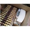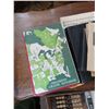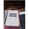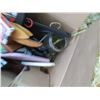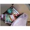 SIDE TABLE WITH MAGAZINE HOLDER, LAMP, BOOKS, BOXES OF MISC