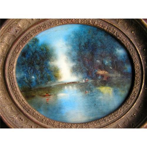 This lovely oil painting on board in French impressionist style depicts boater on a calm lake surrounded by thick and lush woods, with glare from a rising or setting sun streaming between the trees and lighting the background. Board measures approximately 9 1/2" by 11 3/4" and frame measures 14 5/8" by 16 5/8". Purchased at auction at C.G. Sloan & Company in New York approximately 25 years ago, along with another similar work (which we recently sold) which is signed and dated "S Sideris 72" (for 1972). Colors are vibrant and the ornate frame is in excellent condition. Both paintings are believed to be original works by the Greek-born American painter, Stephanos Sideris (1921 - ?). Sideris