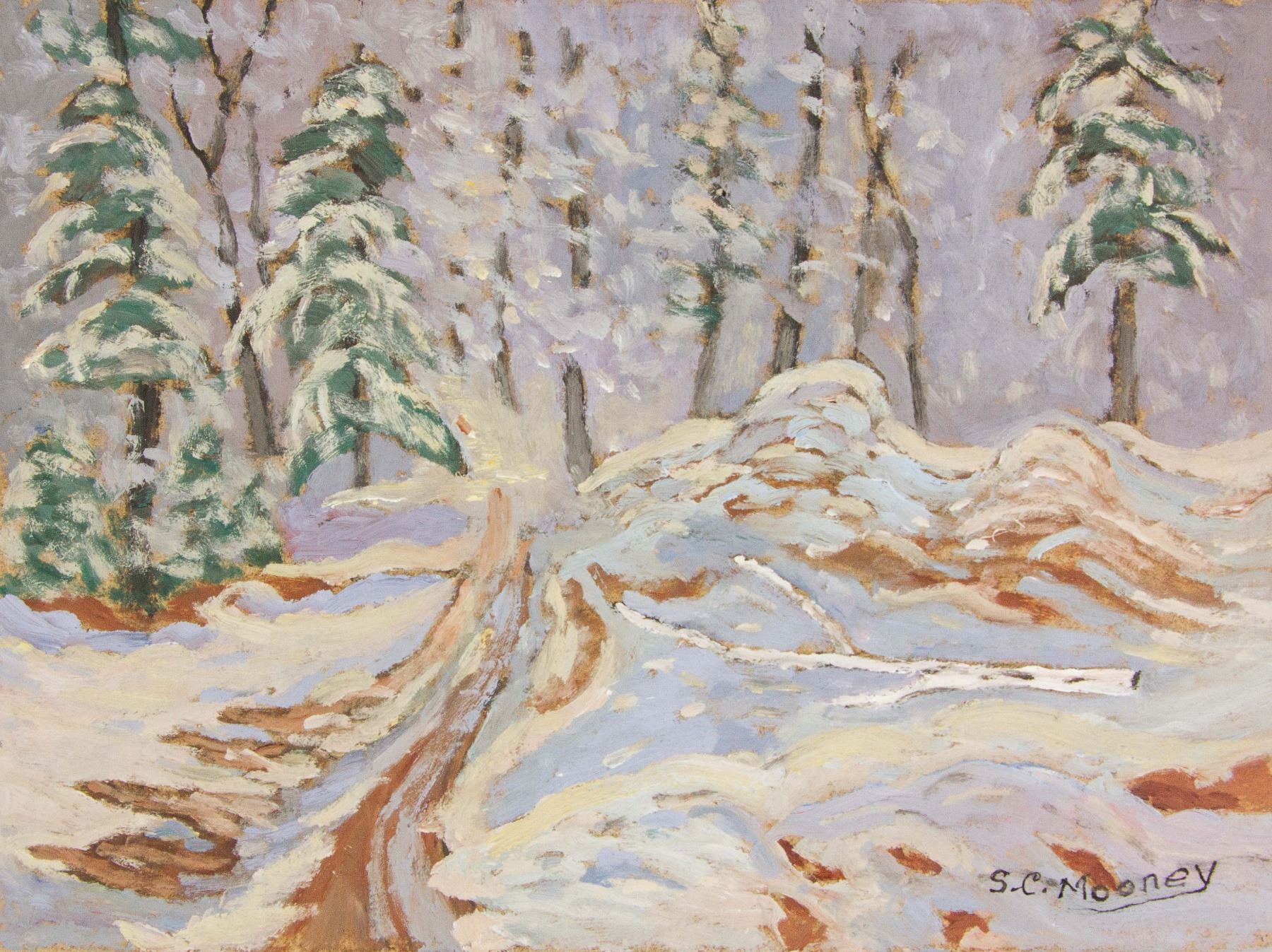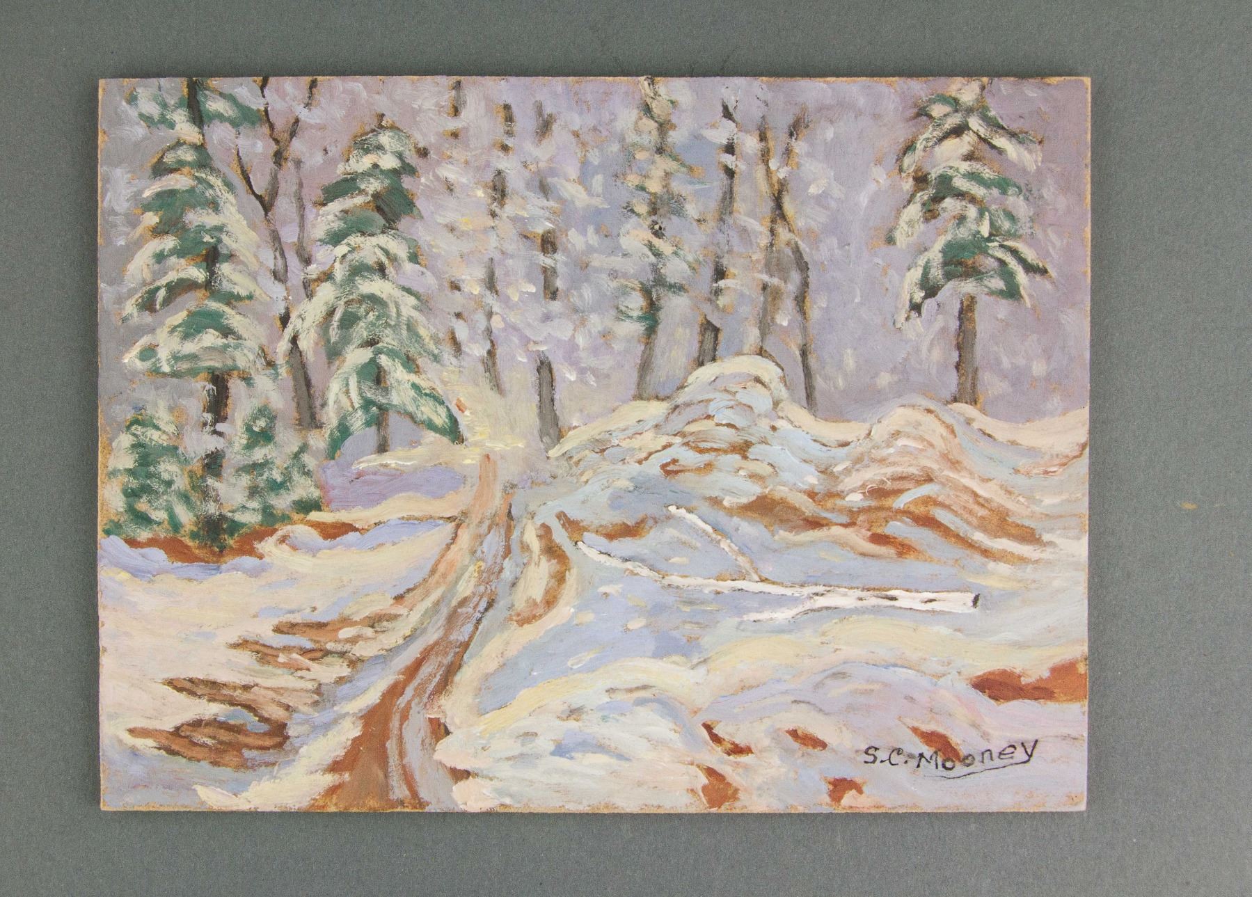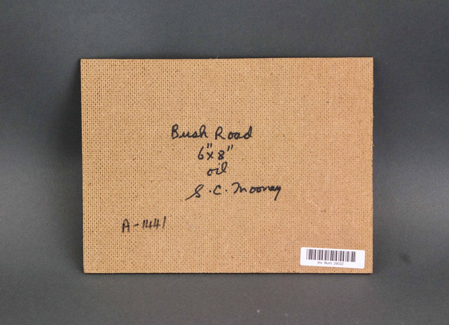 Oil on board. Featuring landscape scene. Entitled, "Bush Road." Signed and attr. Sidney Charles Mooney (Canadian, b.1927) with inscription of title on verso. 6 x 8 in. (15.2 x 20.32 cm). Sidney Charles Mooney is a Canadian painter who was born in 1927. Many works by the artist have been sold at auction, including 'Sun & Shadow' sold at Walker's Fine Art & Estate Auctioneers 'International Fine Arts Auction' in 2011. PROVENANCE: Private collection (Toronto, ON)