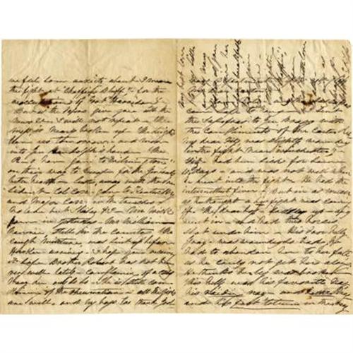 <B>SIDNEY SMITH LEE CIVIL WAR LETTER MENTIONS SON FITZHUGH LEE’S WOUNDING.</B></I> Autograph Letter Signed, “<I>S S Lee</B></I>”, four pages, 5.5” x 8.5", likely Richmond, Virginia, n.d., to (Charles) Carter Lee, n.p. The letter reads in part, “…<I>My dear Fitz was slightly wounded in the fight near Winchester…and had two horses shot under him…My dear boy wrote to me after he was wounded and said he had done his best…the ball that struck him went through a thigh and through the saddle and killed the horse. So much for the fight in the valley…</B></I>”. With later unstamped envelope imprinted for the U. S. Consul at Havana.<BR><BR>Fitzhugh Lee was a talented Confederate major general commanding a division of hardened rebel cavalry. Both the author of this letter and its recipient were brothers to General Robert E. Lee.<BR><BR><B>Condition: </B></I>Very good.<BR><BR><b>Shipping:</b> Flat Material, Small (<a target="_blank" href="http://www.heritageauctions.com/common/shipping.php">view shipping information</a>)
