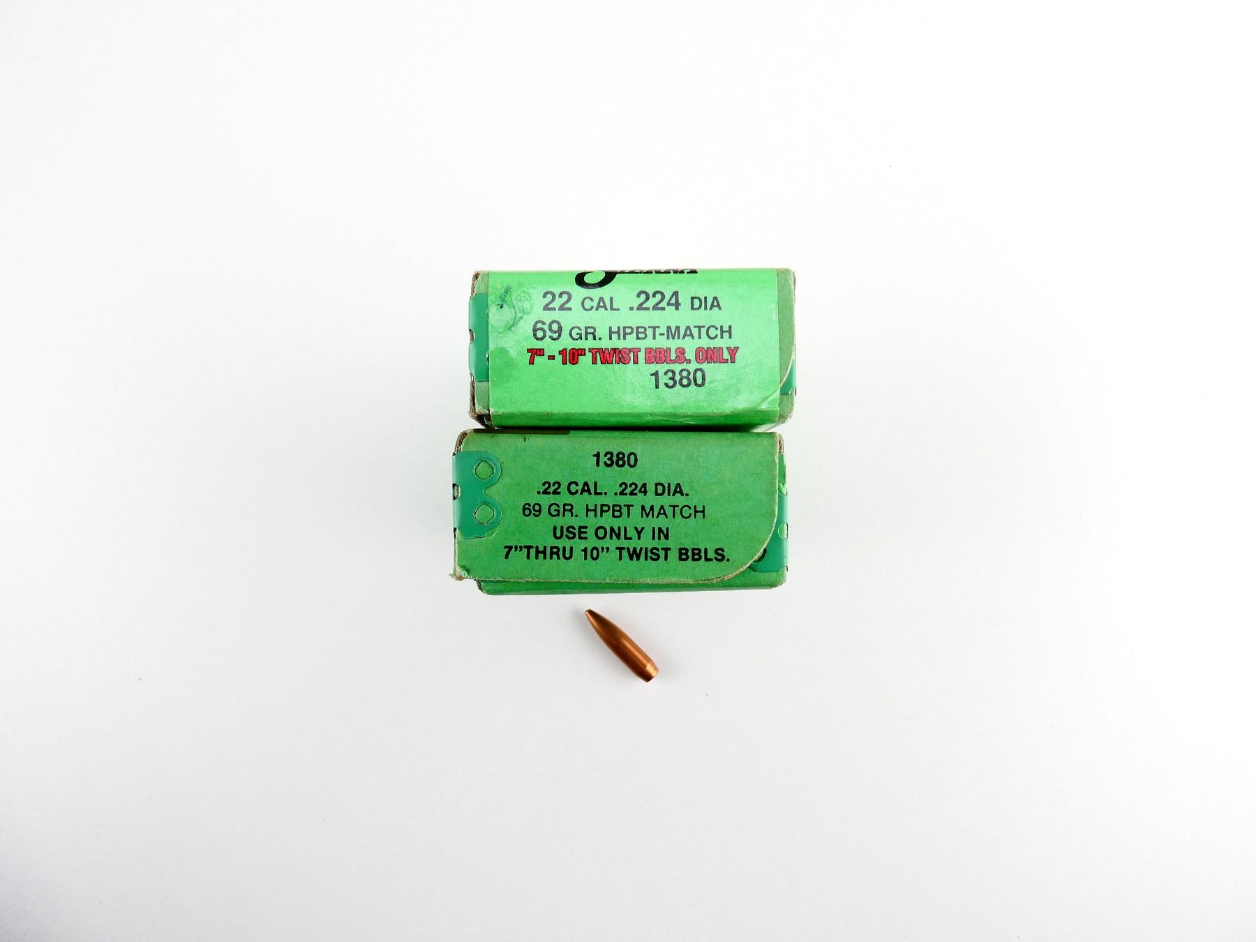 LOT INCLUDES; APPROX. (140) BULLETS, APPROX. DIA .224", 69 GRNS (STATED ON BOXES NOT CONFIRMED) HPBT MATCH, USE ONLY IN 7"-10" TWIST BBLS, (1) UNOPENED.