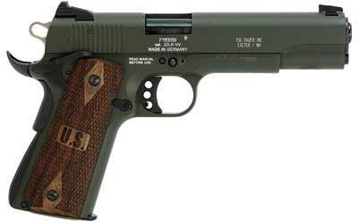 Manufacturer: Sig Sauer Model: 1911-22 Action: Semi-automatic Type: 1911 Size: Full Caliber: 22LR Barrel Length: 5" Frame/Material: Alloy Finish/Color: OD Green Grips/Stock: Wood Grips/Stock: WD Capacity: 10Rd Accessories: 1 Mag Type of Barrel: non-extended threaded barrel Sights: Fixed Sights Manufacturer Part #: 1911-22-OD