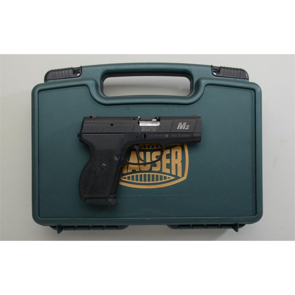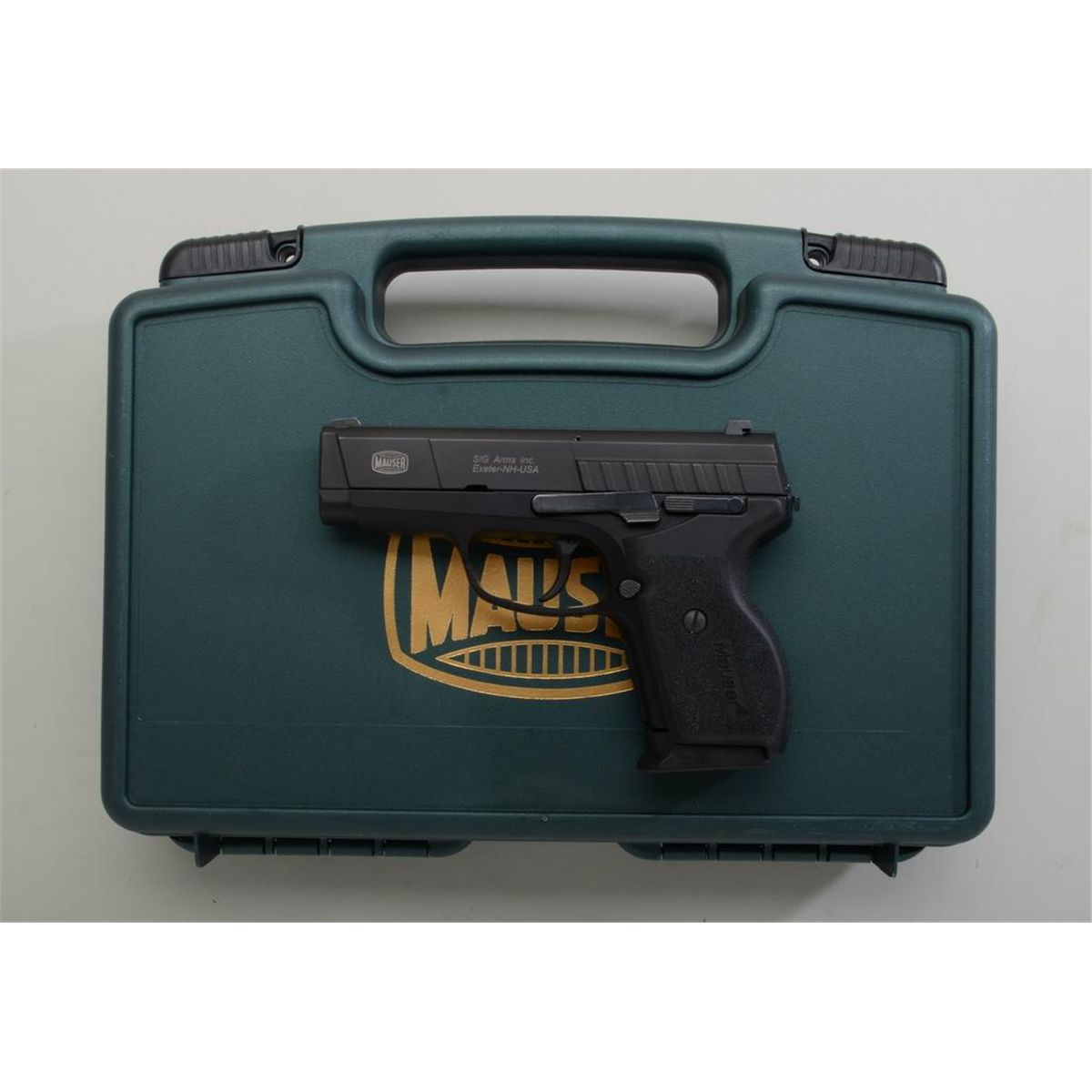 SIG Arms Mauser M2 Model semi-auto pistol in factory plastic carry case with extra magazine and instructions booklet, mat black finish, .45 cal., 3-1/2” barrel, #MC005 470. This gun is in overall excellent conditionshowing little use or handling. The action is an enclosed hammerless striker-fired design with aluminum alloy frame and steel slide; fine carry case. Est.: $500-$1,000.