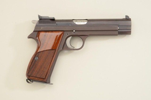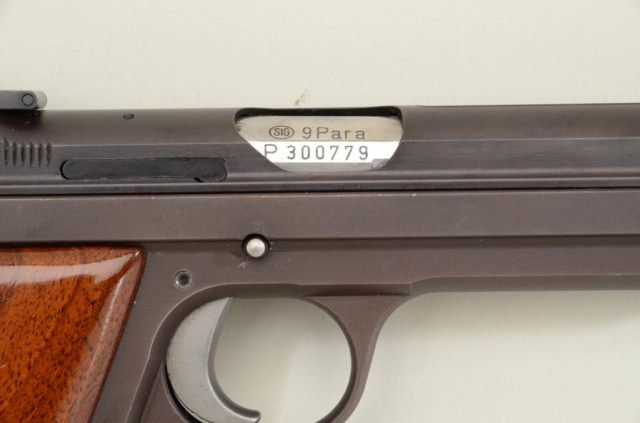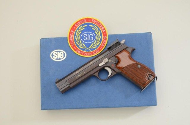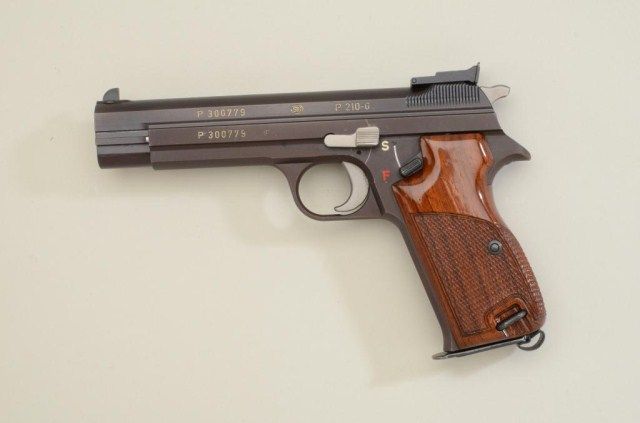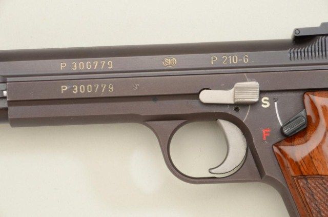 SIG P210-6, 9mm semi-auto in box in near excellent original condition #P300779. 97-99% - minor use with targets and patch. Considered among the finest quality pistols ever produced by European craftsman.Est.:$1,500-$3,000.