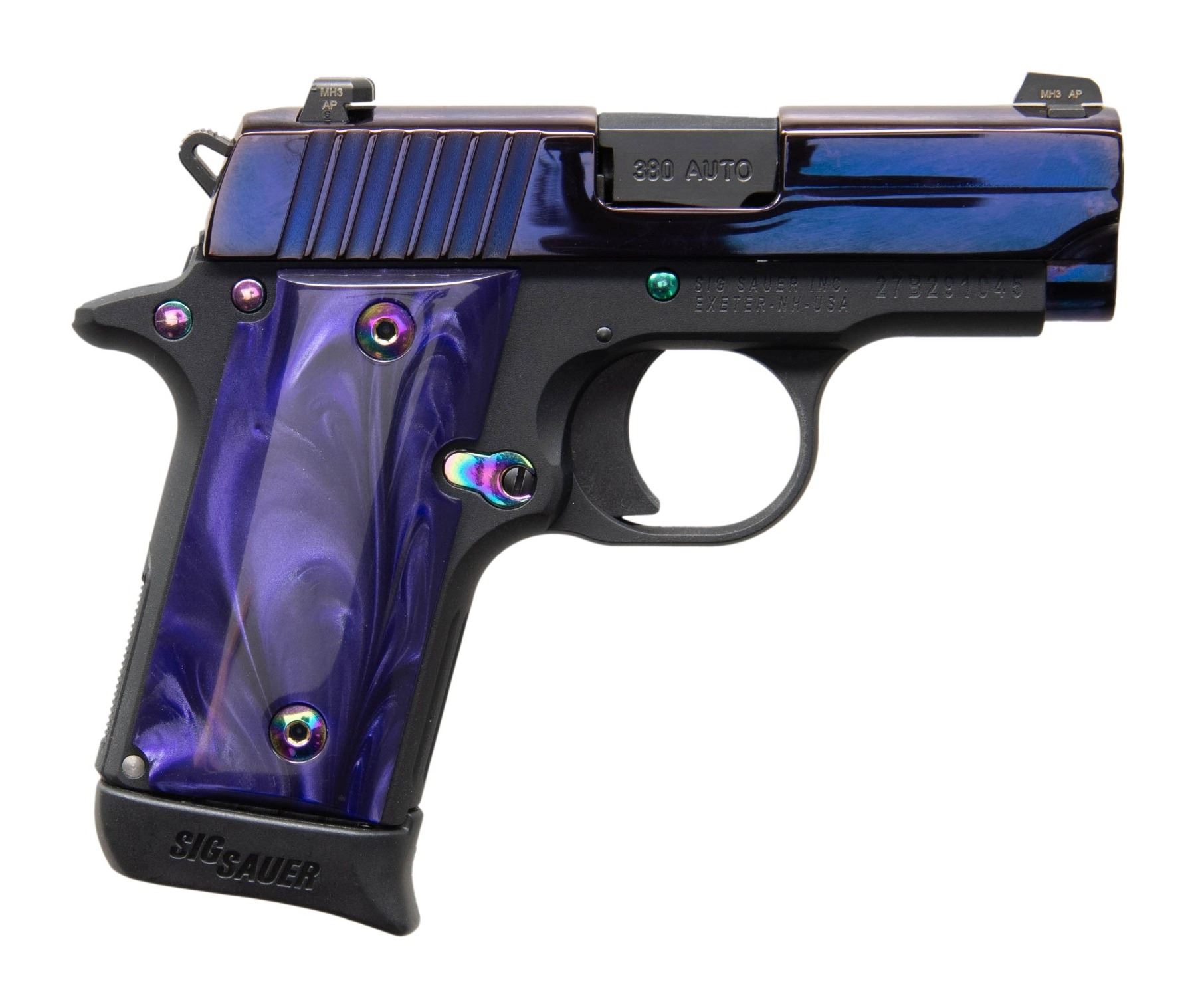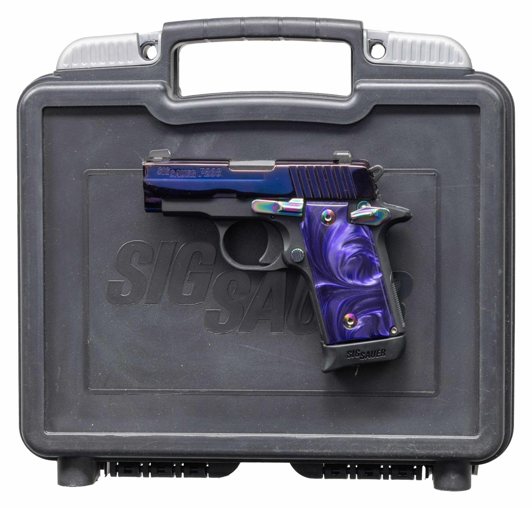 Cal. 380 ACP. S# 27B291045. Bbl. 2 3/4". Three dot night sights. 1911 style compact pistol. Purple finished slide. Small parts have rainbow finish. Matte black frame. Purple grips. MAGS: 2-6 rd. UNATTACHED ACCESSORIES: matching numbered factory hardcase with holster, lock & manual. CONDITION: all aspects near excellent. (25-5292/MJC). MODERN. $300-500.
