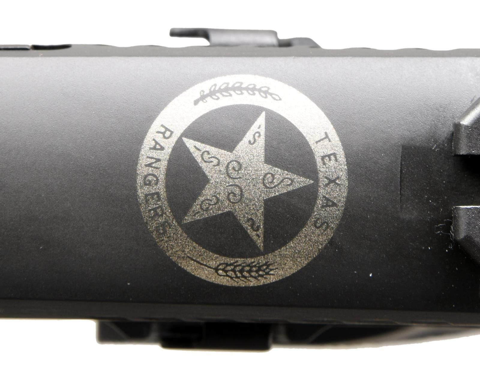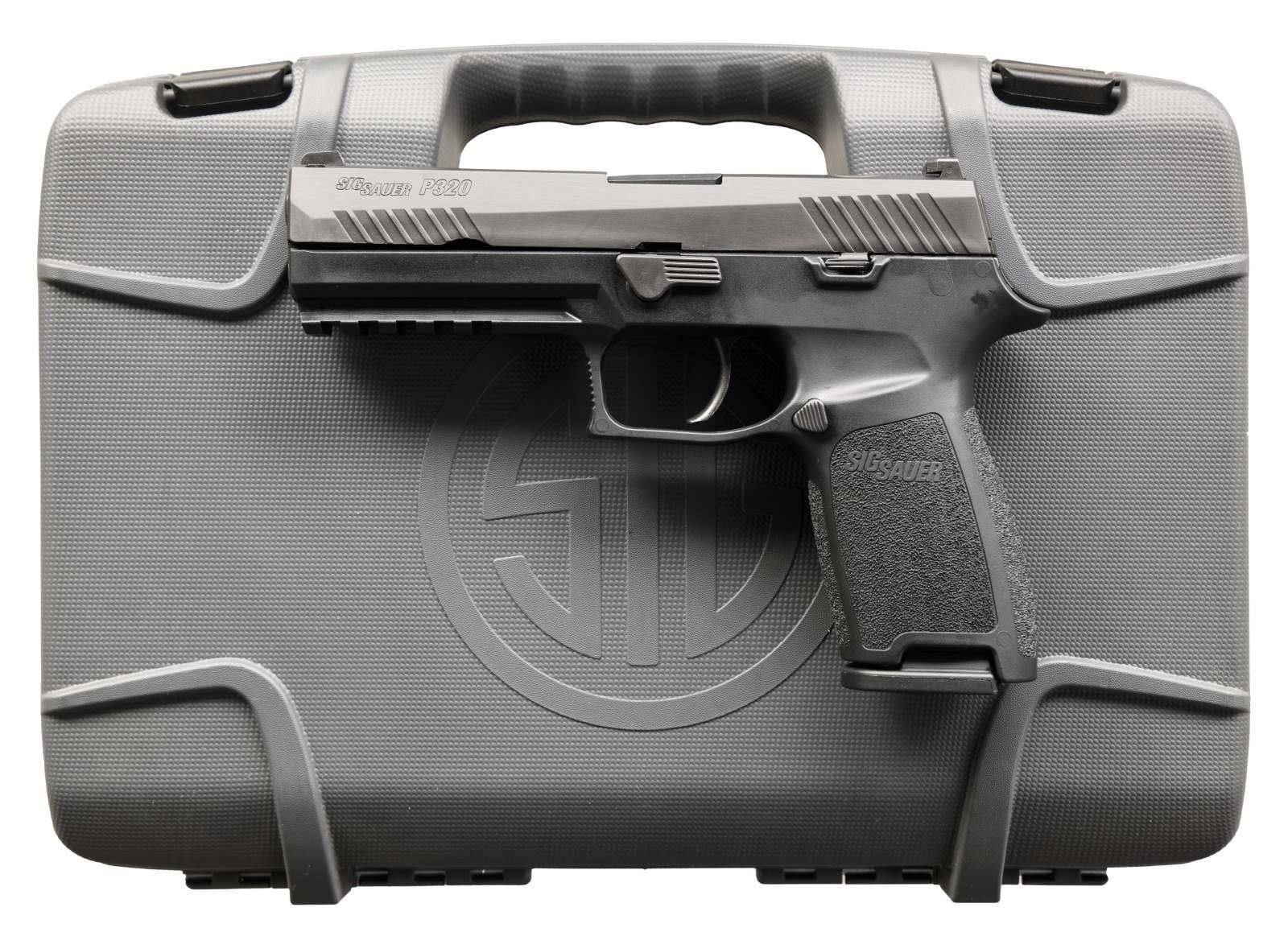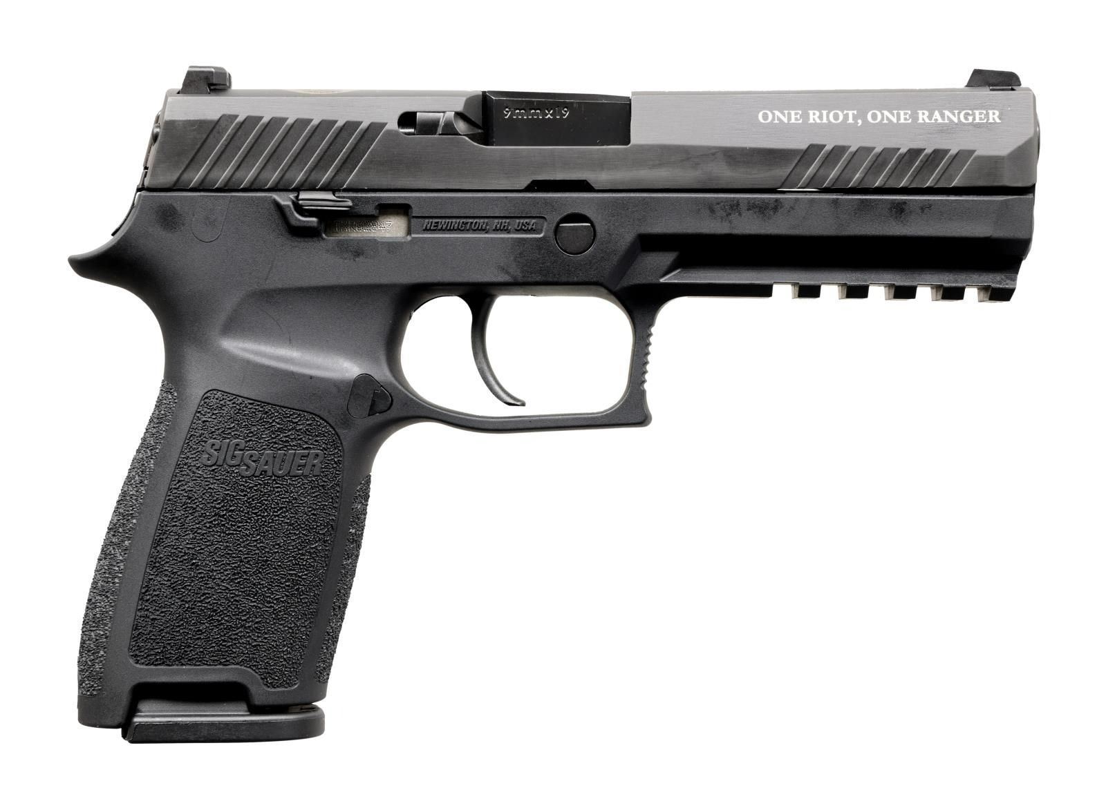 Cal. 9mm Luger. S# TXR02847. Bbl. 4 3/4". Three dot night sights. Texas Ranger commemorative P320 w/ top of slide having Texas Ranger badge logo & right side having "ONE RIOT, ONE RANGER". Matte black finish. Ambi slide release. Polymer frame w/ accessory rail. MAGS: 2-17 rd. UNATTACHED ACCESSORIES: matching numbered factory hardcase w/ foam inserts, manual, paperwork, cable lock & Texas Ranger badge. CONDITION: all aspects near excellent. PROVENANCE: The Collection of Gun Sport Ltd owned by Jon R. Thomas. (23-2959/MJC). MODERN. $400-600.