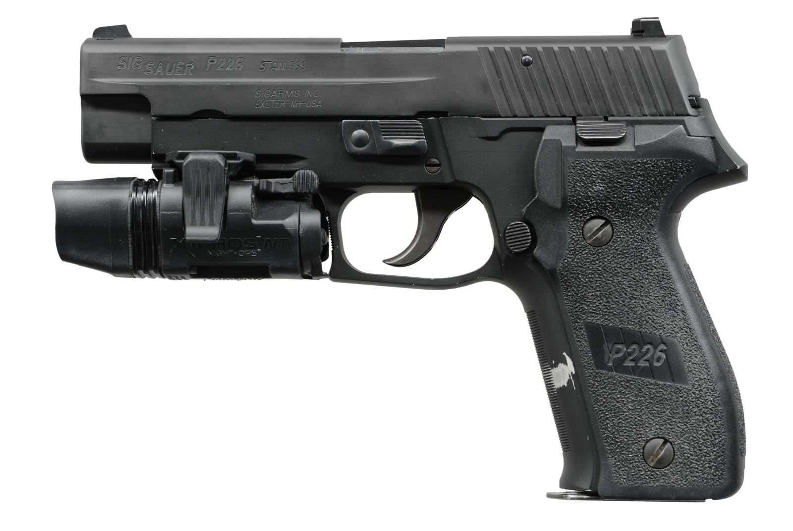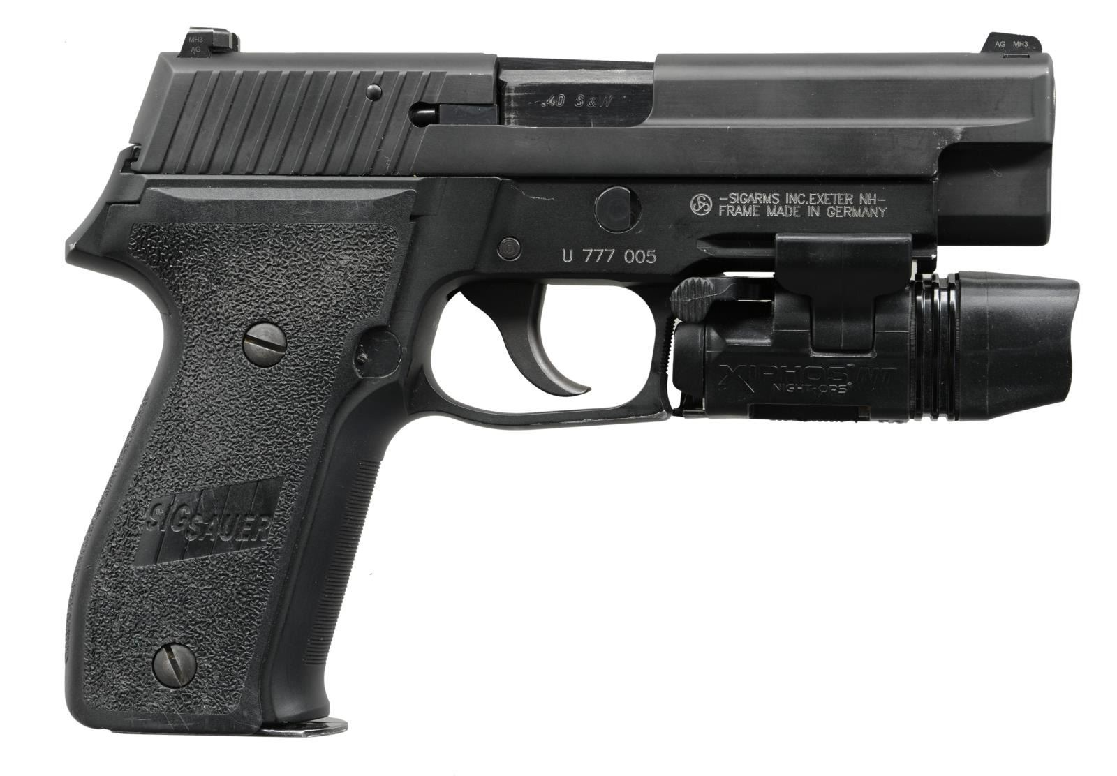 Cal. 40 S&W. S# U 777 005. Bbl. 4.4". Mfg. July 2007 per back sides of pebble grained plastic grips. Matte black "STAINLESS" marked slide with NH markings. Alloy frame made in Germany. Fitted with night sights (dead) and Xiphos NT Night-Ops LED light of 65 lumens using CR123 battery (ambidextrous trigger finger activation) on factory accessory rail. Action is DA only. Hooked trigger guard with grooved face plus grooved high cut frontstrap. MAGS: good factory 12 rd. marked for ".357" and ".40". CONDITION: bright wear spot on frontstrap and high edges of trigger guard; all other aspects near excellent including bore. (23-1547/NW). MODERN. $550-800.