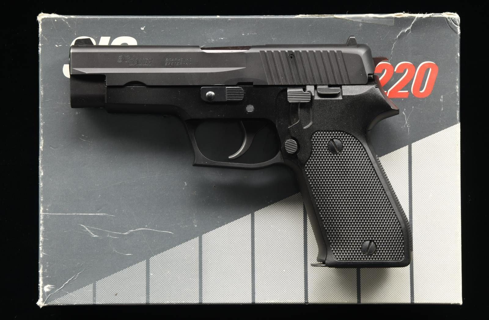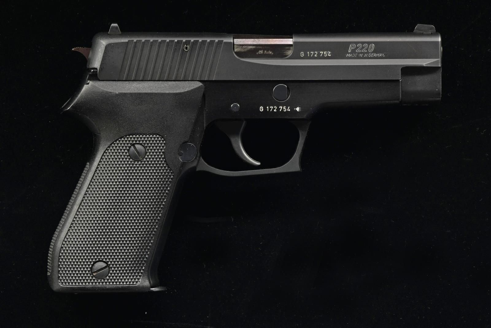 Cal. 45 ACP. S# G172754. Bbl. 4 1/4". White dot front sight. White outline rear sight. West German made SIG w/ Exeter, NH import marking. Matte black finish. Checkered black grips. MAGS: 3-8 rd. UNATTACHED ACCESSORIES: matching numbered factory box w/ foam insert, manual, factory test target & paperwork. CONDITION: all aspects rate very good or better w/ some light scratches, handling & operational wear. (23-5021/MJC). MODERN. $400-600.