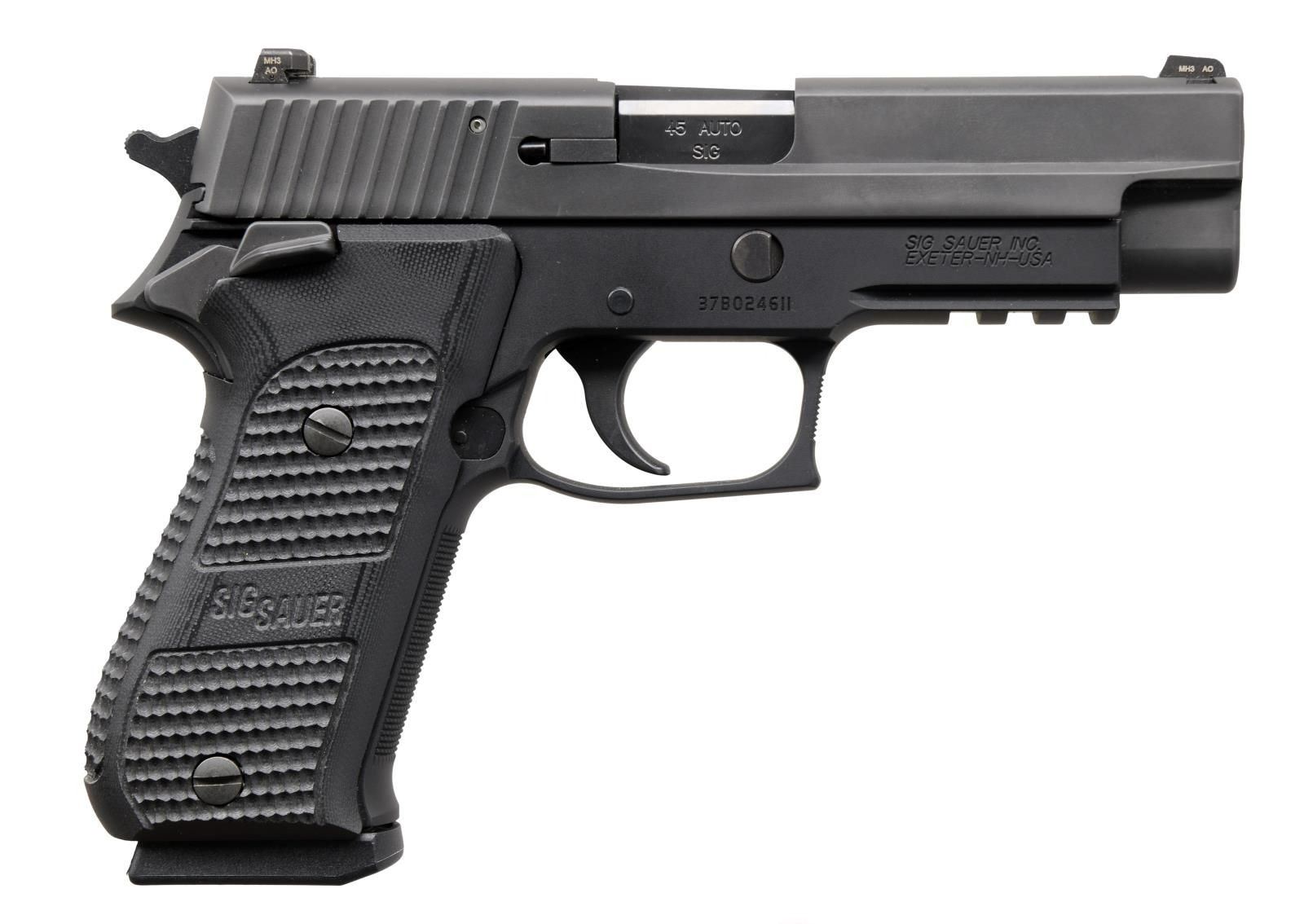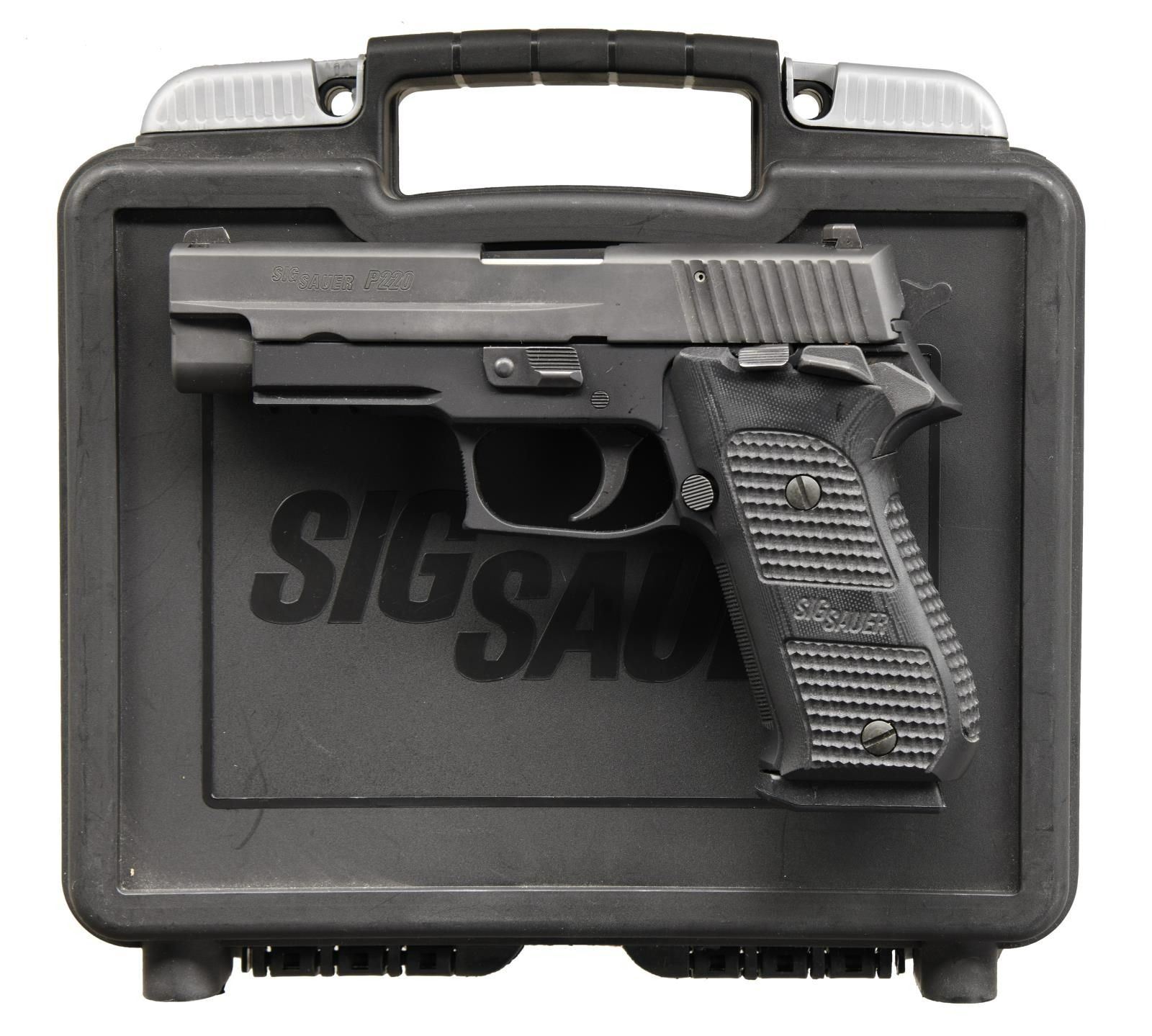 Cal. 45 ACP. S# 37B024611 Bbl 4 3/8”. Sig Sauer P220, nitron finished, with night sights in .45 ACP caliber. The left side of the slide is marked by the manufacturer and model number. Caliber and “SIG” on the right side of the exposed chamber. Right side of the frame is marked with the manufacturer location in Exeter, NH and the full serial number. Frame with picatinny rail and fine checkering on the front strap. Fitted with a wrap around grip having five coarsely checkered panels, the left and right side of the grip including the word “SIG SAUER”. Single column magazine with each side showing indicator holes 2-8, the the left side marked with manufacturer, model, and caliber; “MADE IN IN ITALY” appearing on right side. UNATTACHED ACCESSORIES: w/box. CONDITION: virtually new showing no sharp edge wear or scuff marks even on the top of the chamber. Mirror bore. Perfect manual mechanics. Beautiful gun that would pass for new. PROVENANCE: The Collection of Gun Sport Ltd owned by Jon R. Thomas. (23-4508/LA). MODERN. $550-800.