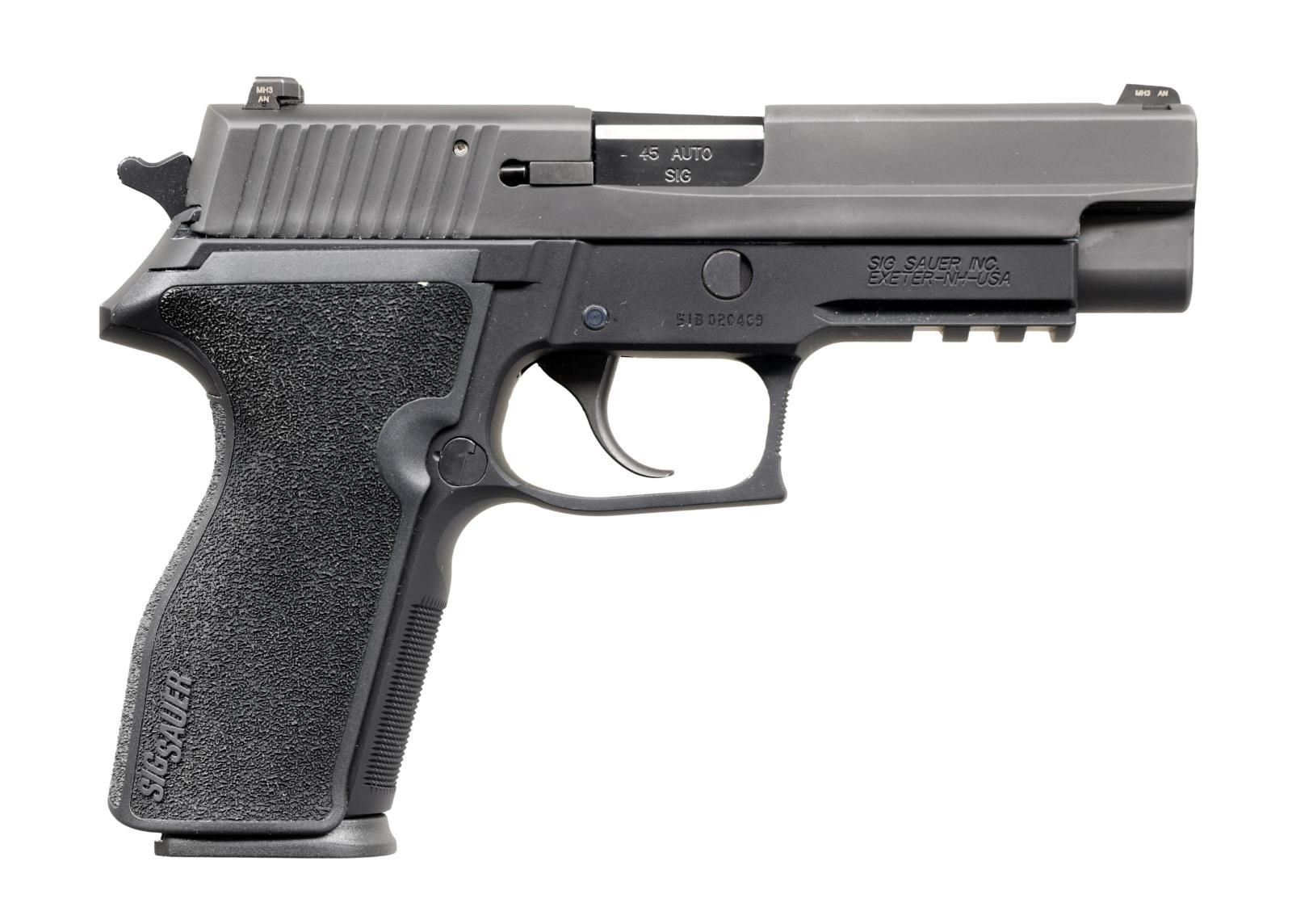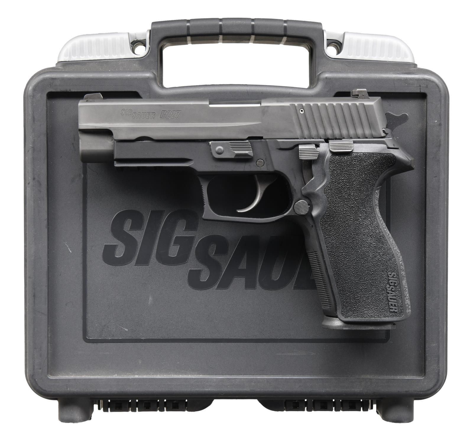 Cal. 45 ACP. S# 51B020469. Bbl 4 ?”. Sig Sauer P227, nitron finished, with night sights in .45 ACP caliber. The left side of the slide is marked by the manufacturer and model number. Caliber and “SIG” on the right side of the exposed chamber. Right side of the frame is marked with the manufacturer location in Exeter, NH and the full serial number. Frame with picatinny rail and fine checkering on the front strap. Fitted with a wrap around grip having three textured panels, the left and right side molded with the Sig Sauer name. Magazine marked with manufacturer model and caliber (left side). Indicator holes 6/10 “MADE IN ITALY” on right side. P227 molded into the detachable floorplate. UNATTACHED ACCESSORIES: w/box. CONDITION: gun presents as virtually new with no sharp edge wear or scuffing. Mirror bore with sharp rifling. Perfect manual mechanics. PROVENANCE: The Collection of Gun Sport Ltd owned by Jon R. Thomas. (23-4411/LA). MODERN. $650-950.