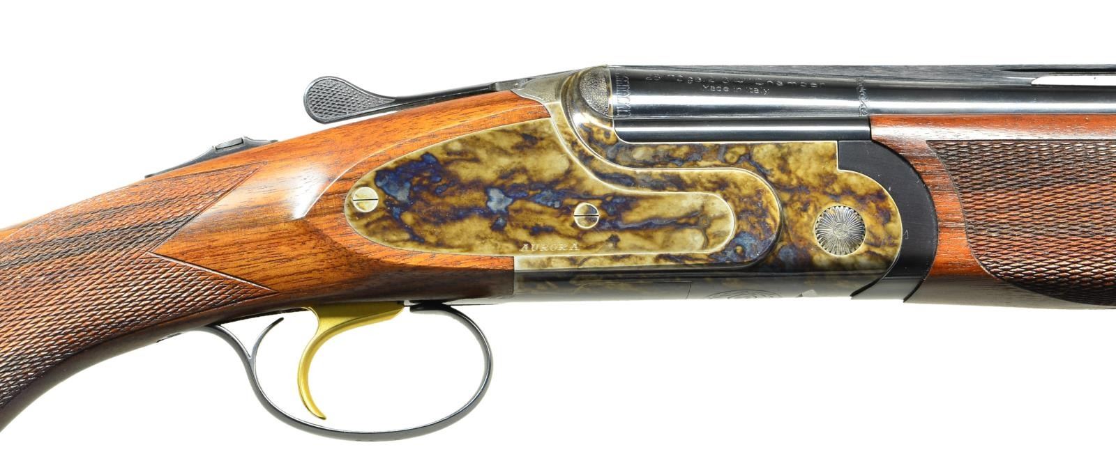 Cal. 28 ga., 2 3/4". S# EX02036. Bbls. 28" vent rib with interchangeable chokes, F, IM, M and IC tubes included. Case colored side plated action with gold finished SST and selective ejectors. Schnabel tipped forearm and round knob pistol grip stock of satin finished thin shell walnut with 6 lbs., 3.6 oz. UNATTACHED ACCESSORIES: spare chokes and 2 A-Zoom snap caps. CONDITION: near excellent retaining over 98% original finish. Stock shows a couple of small handling marks. Bright near excellent bores. (22-3887/DS). MODERN. $1,500-2,000.