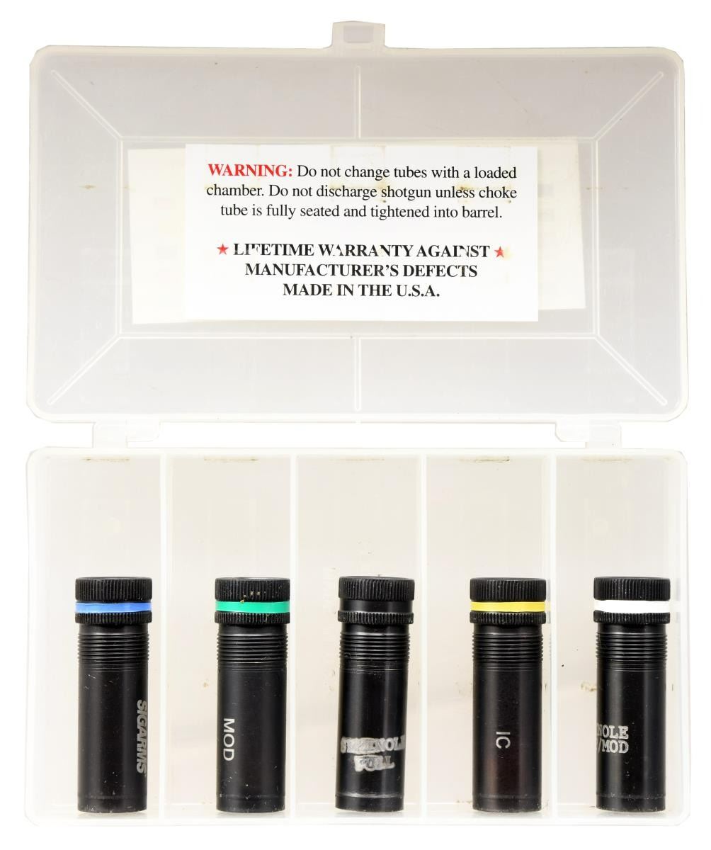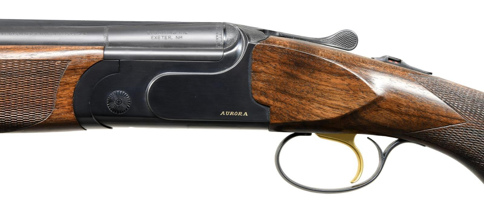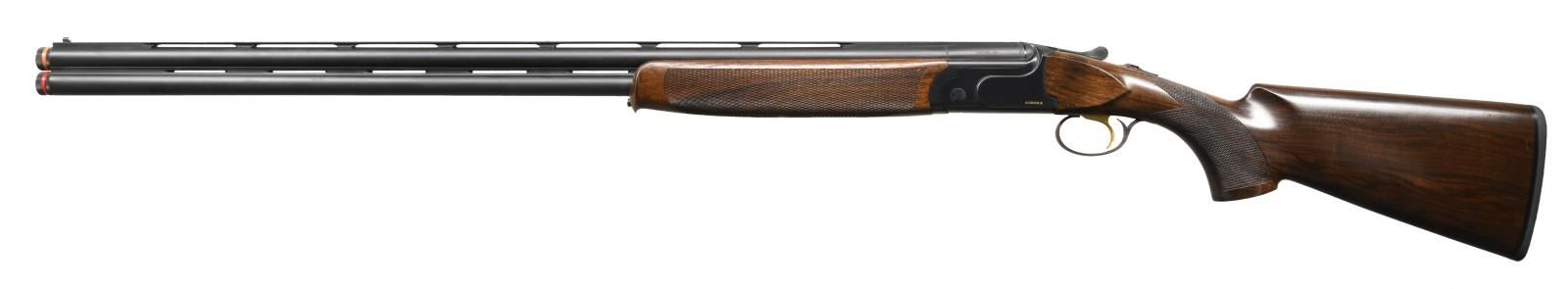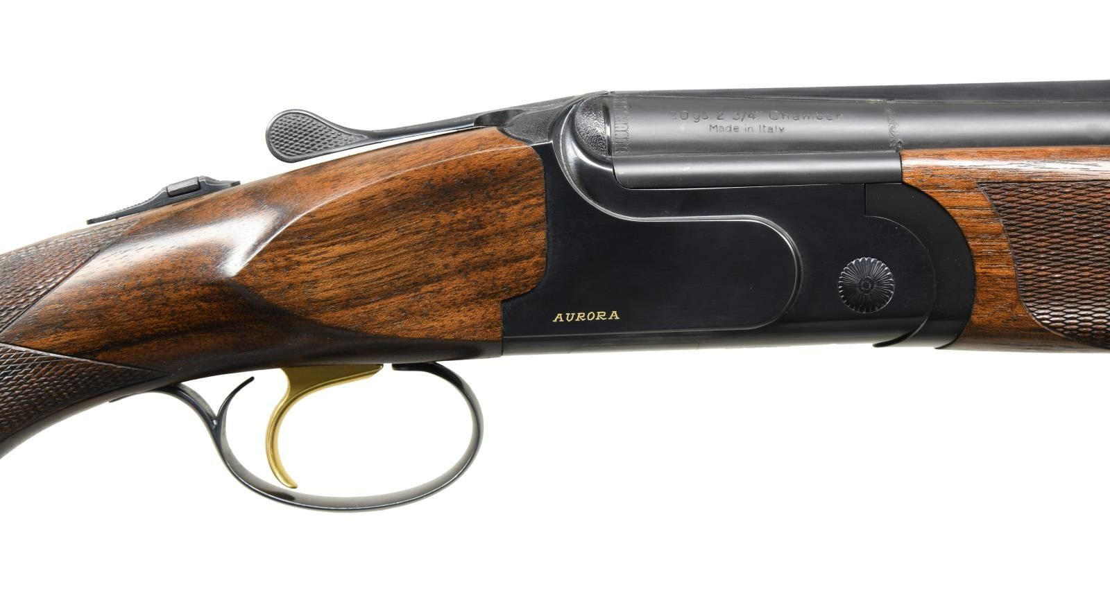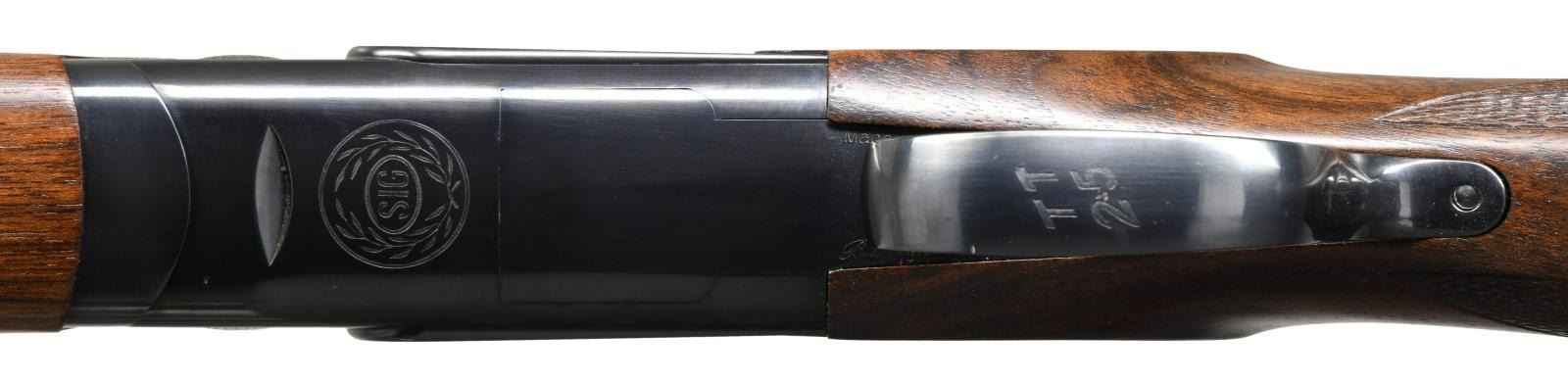 RIZZINI OF ITALY. Cal. 20 Ga., 2 3/4". S# EX04230 (BS = 2002). VR 30" bbls. w/ white target front sight & mid bead. Full set of 6 Sig Arms choke tubes & 1 Skeet Seminole Choke tube. Matte finish. Gold finished SST. Ejectors. Trigger guard bow engraved "TT / 25". Floorplate signed by trigger "Bottega C. Giovanelli" American dimension checkered walnut stock set w/ Schnabel tip & black recoil pad. UNATTACHED ACCESSORIES: choke tube case. CONDITION: near excellent metal & wood finish w/ minute handling marks. Bright shiny bores w/ light fouling forward of chamber. (23-1264/MD). MODERN. $1,200-1,800.