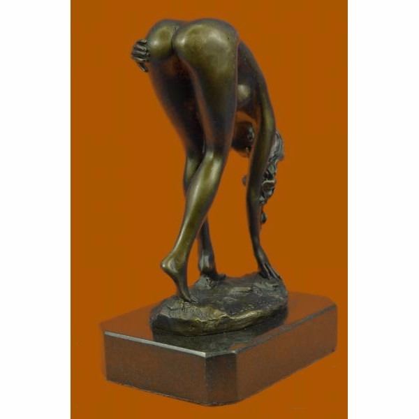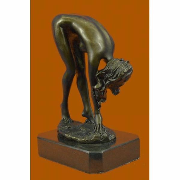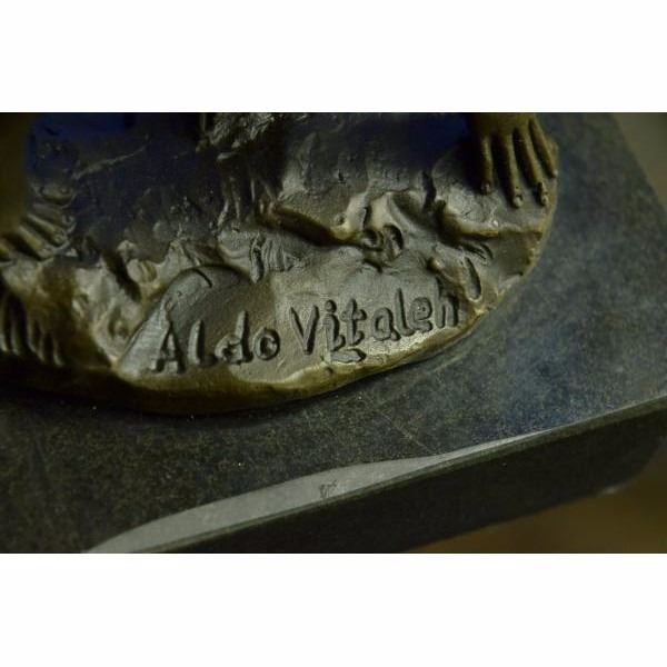 The beautiful nude, with flexibility, throws her arms to the ground, her hair cascading down, while her legs slightly bent on tiptoes. She she seems to stretch her sensuality from head to toes in a seductive arch that exhibits her shapely form. The 100% handmade bronze sculpture, was cast using the early method of lost-wax casting and stained with a brown patina finish for preservation. The black marble base has the European Bronze Finery stamp ensuring quality and the artist Aldo Vitaleh's signature. Condition: This sculpture is in Perfect condition. Bronze Dimensions with Marble Base:Height 8" X Width 5" Marble Dimensions: 5" X 3.5 " . Height without base: 7" Weight : 5 LBS Inventory: 54Y021A2945