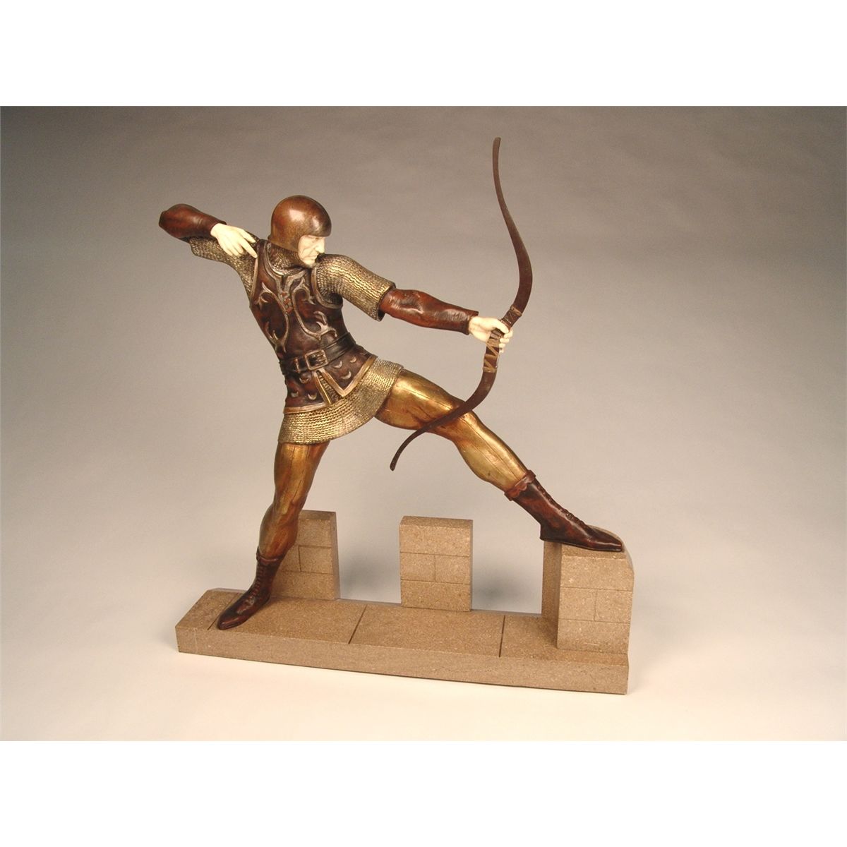 Circa 1925, 'SIGNAL MAN' or ARCHER patinated and silvered bronze and ivory, heightened with colour, on crenellated stone base the base marked 'Le Faguays' Measures 23.5" W x 26.5" H.