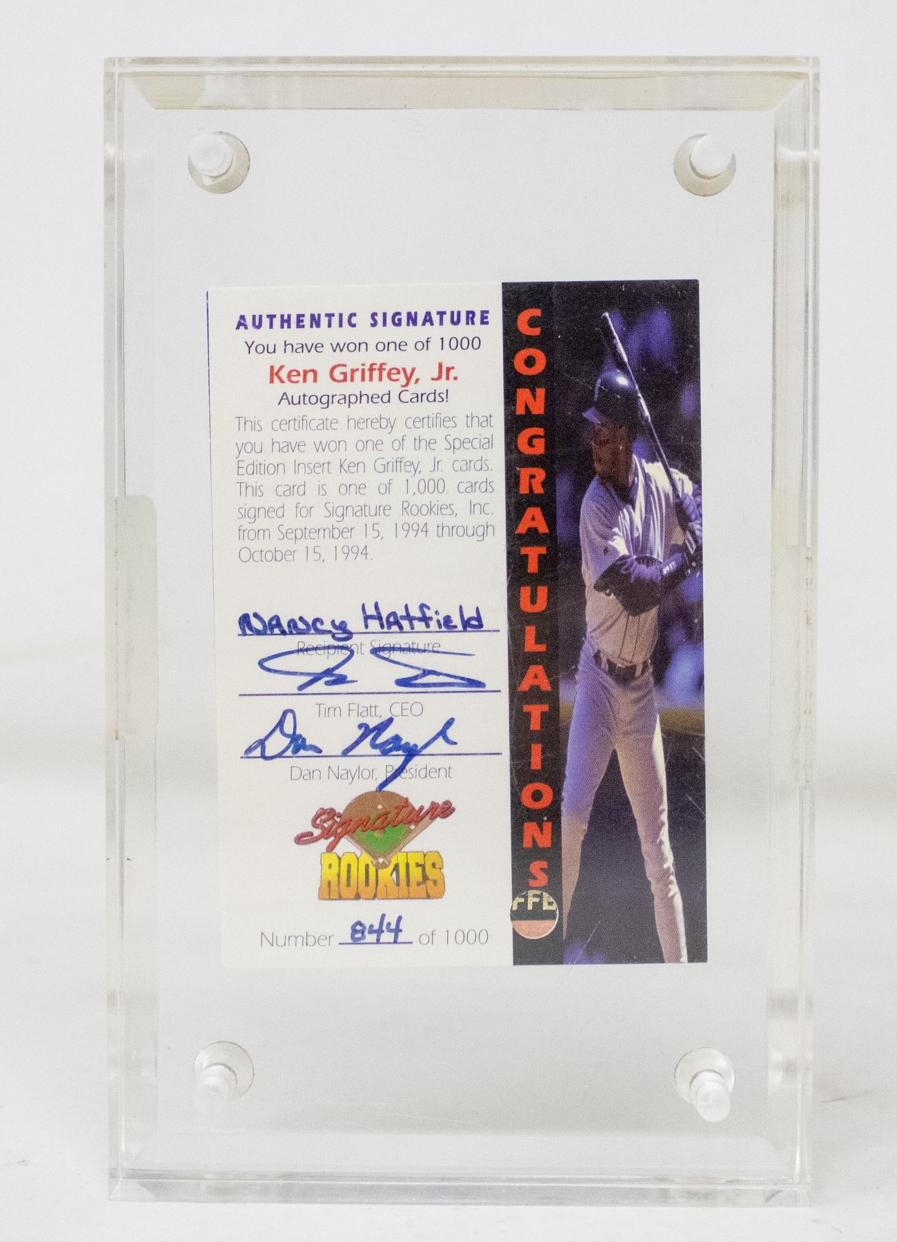 ONLY 15,000 OF THE ORIGINAL CARDS WERE EVER PRODUCED WITH KEN GRIFFEY JR ONLY SIGNING 1000 OF THEM. PLAYER LICENSED, WITH THE SIGNATURE ROOKIES AUTHENTICITY ON A SECONDARY CARD, SEALED FROM FACTORY IN THE ORIGINAL CASING. I HAVE ONLY EVER