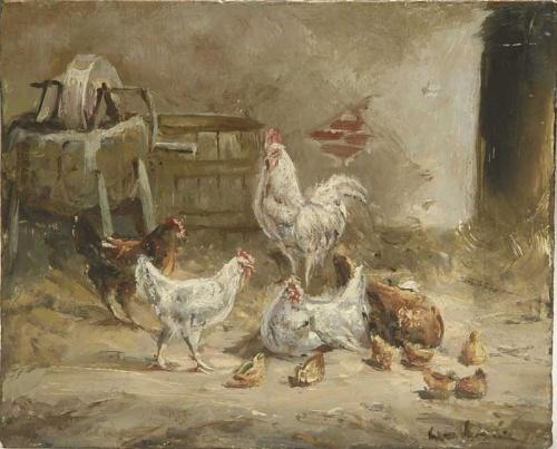 SIGNED (19th/20th Century) BARN CHICKENS. Oil on wood panel scene shows a large white rooster standing over four brown and white hens with seven chicks. A floor model sharpening wheel and barrel is seen in background with edge of stucco building. Signed lower right which is illegible but very well done. Unframed. SIZE: 5-1/4" x 6-1/4". CONDITION: Generally very good. 9-26688