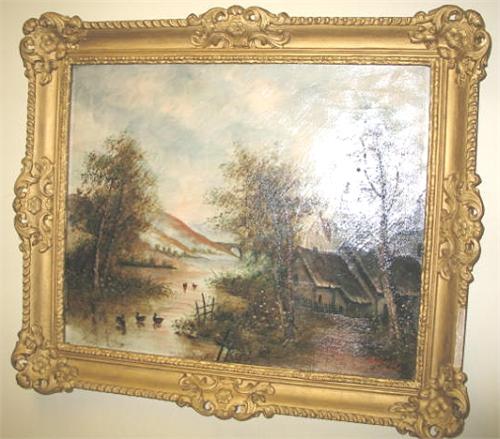 SIGNED 23"X27" RIVER VILLAGE PAINTING ON CANVAS W/GOLD LEAF FRAME (FRAME DAMAGED)