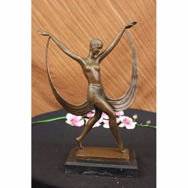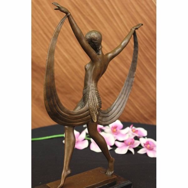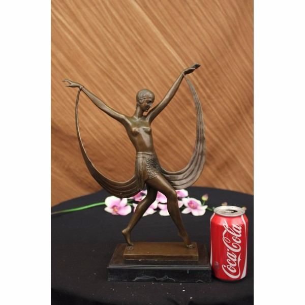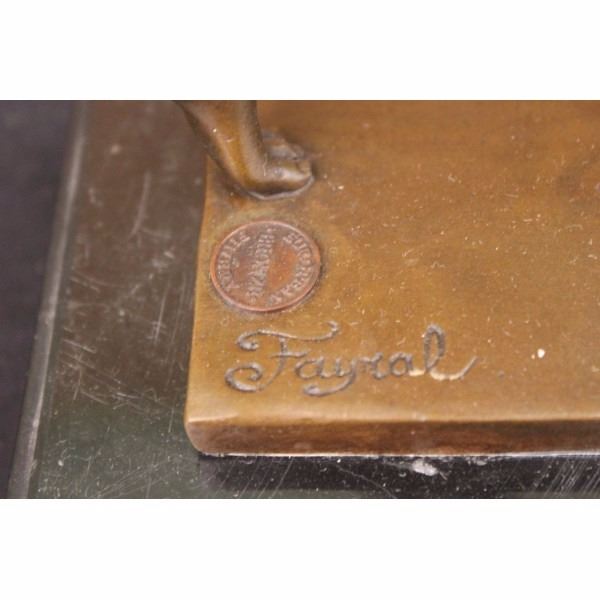 EXQUISITE FAYRAL ART DECO DANCER BRONZE MUSEUM QUALITY SCULPTURE . Beautiful elegant version of this Fayral artwork. It is truly elegant, the photo does not do it justice. This is an excellent Museum quality bronze work of art. This faithfully reproduction of distinguished highly regarded Fayral, prized for his well-known sensual works. Features a young sophisticated beauty poised in mid motion arms gently swaying and body raised on tip toes. A subtle gesture of refined movement and power. Beautifully mounted on a solid marble base. Would make a great gift for yourself or any person who appreciates an extraordinary work of art! Our version is particularly stunning, with a striking patina of bronze and copper tones, highlighted by a subtle gunmetal silverish finish on the Lady's dress. We mount it onto a heavily-veined marble base, and it stands 15" tall. This artwork has incredible detail, workmanship and quality. This is a stunning piece with wonderful movement, elegance and grace. This has been painstaking cast in Bronze using the highest quality lost wax" casting method. This beautiful Bronze sculpture is mounted onto a solid marble base. Each line, curve and detail has been painstakingly reproduced to achieve this captivating artwork. This elegant striking piece would make a splendid impression and fantastic statement in any home or office. This is a truly rare and unique artwork that you can enjoy for years to come. A great work of art that you will cherish for a lifetime, a stunning piece at a very affordable price.This attractive artwork would make a splendid impression and statement anywhere. Features incomparable lines on this art piece. This piece is in excellent NEW MINT CONDITION and is Highly desirable. This item is available for a limited time only so act now. Don't miss your opportunity to own this wonderful piece. WE CARRY THE FINEST Art works in our inventory and is signed FAYRAL Condition : This sculpture is in perfect condition. Bronze Dimensions with Marble Base:Height 15" x Width 10" Marble Dimensions: 7"x 4" Height without base:14" Weight : 10 LBS Inventory:12B4635321