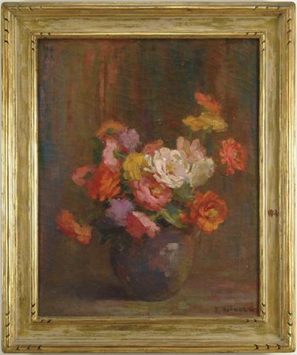 SIGNED (American School, Early 20th Century) VASE OF PEONIES. Oil on canvas signed indistinctly bottom right F. Gi?. Appears to be housed in its original carved wood gilt frame. SIZE: 20in. x 16in.. CONDITION: Craquelure, minor inpainting and paint flecking. 9-26278